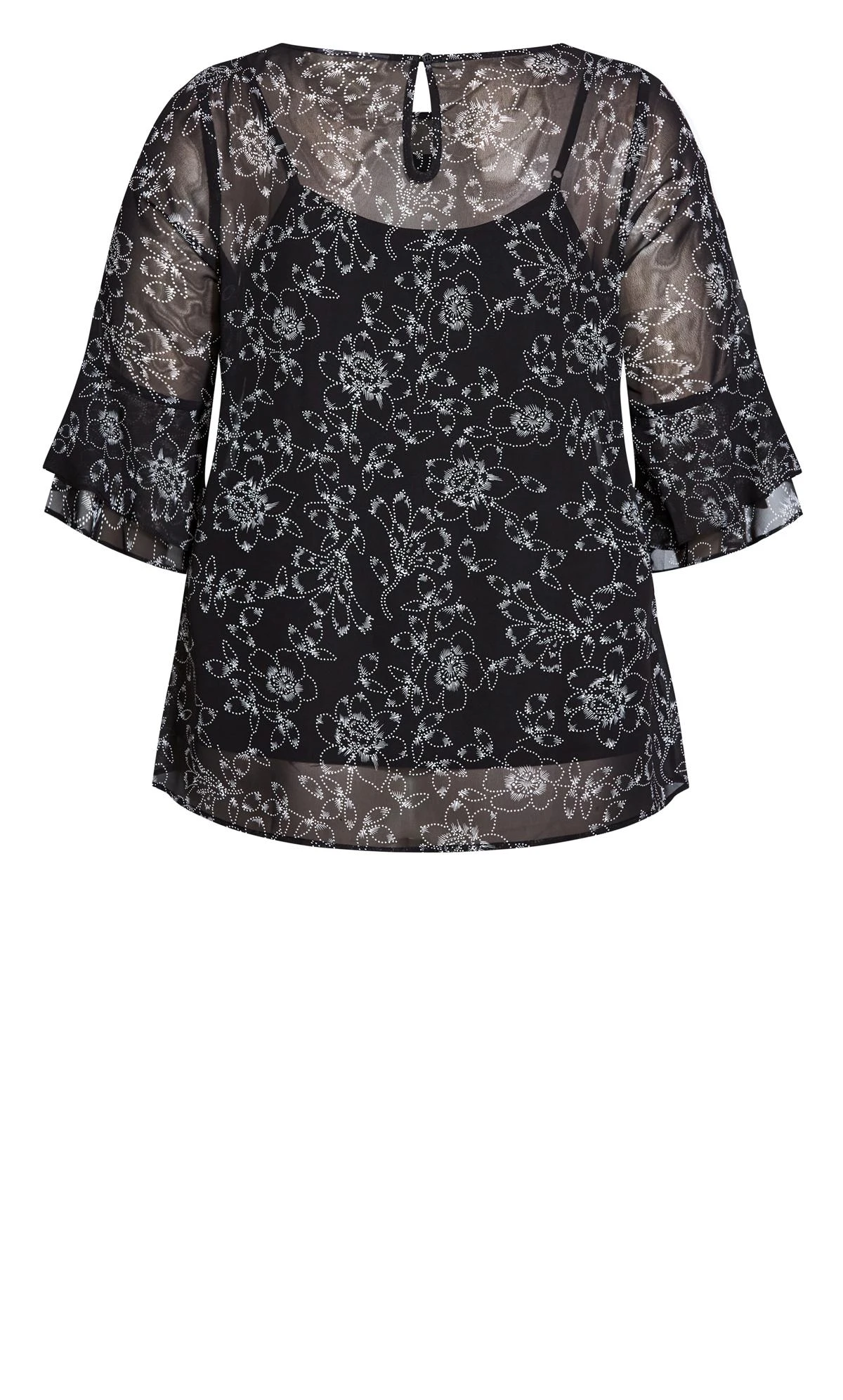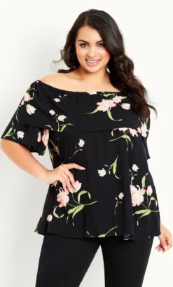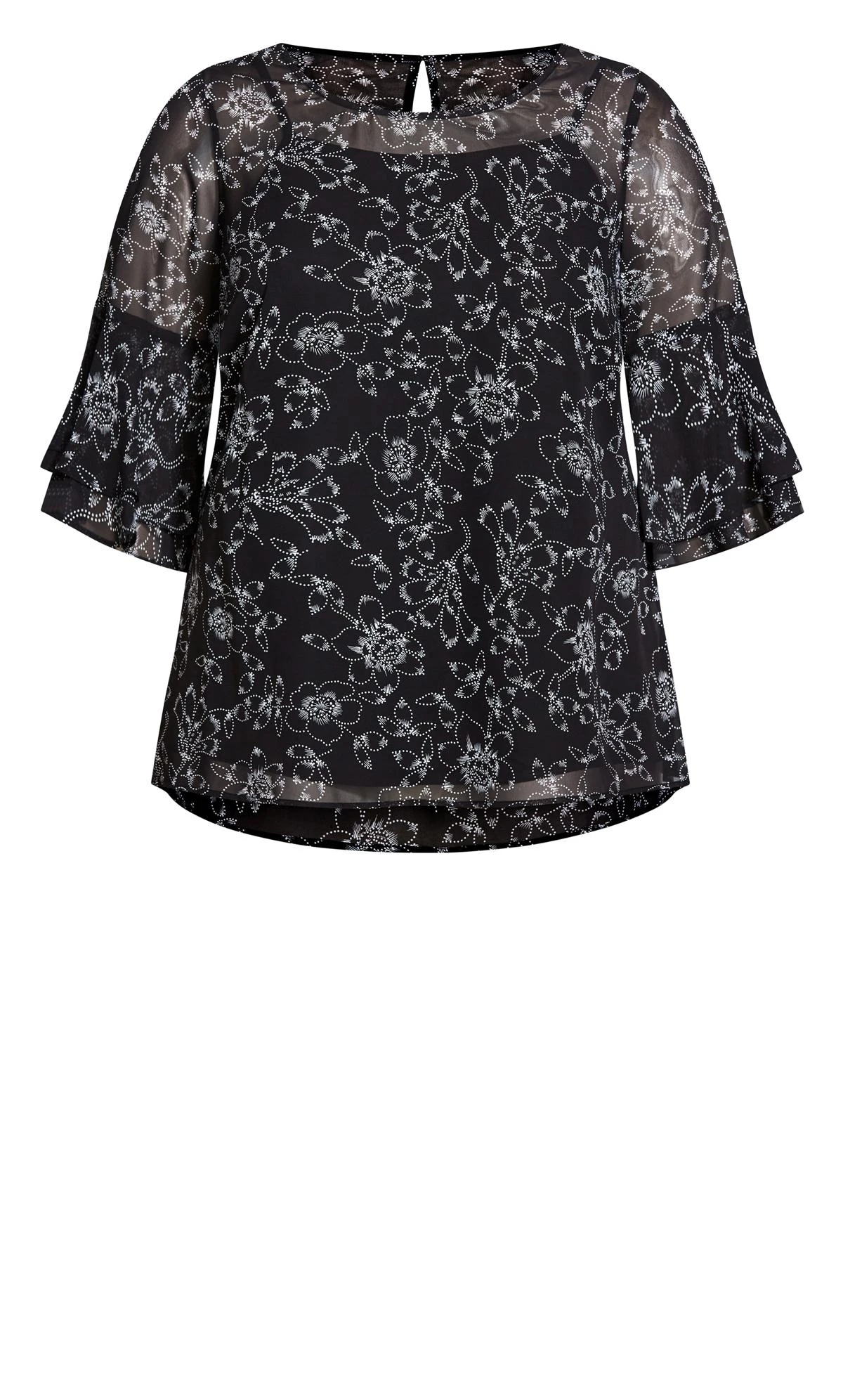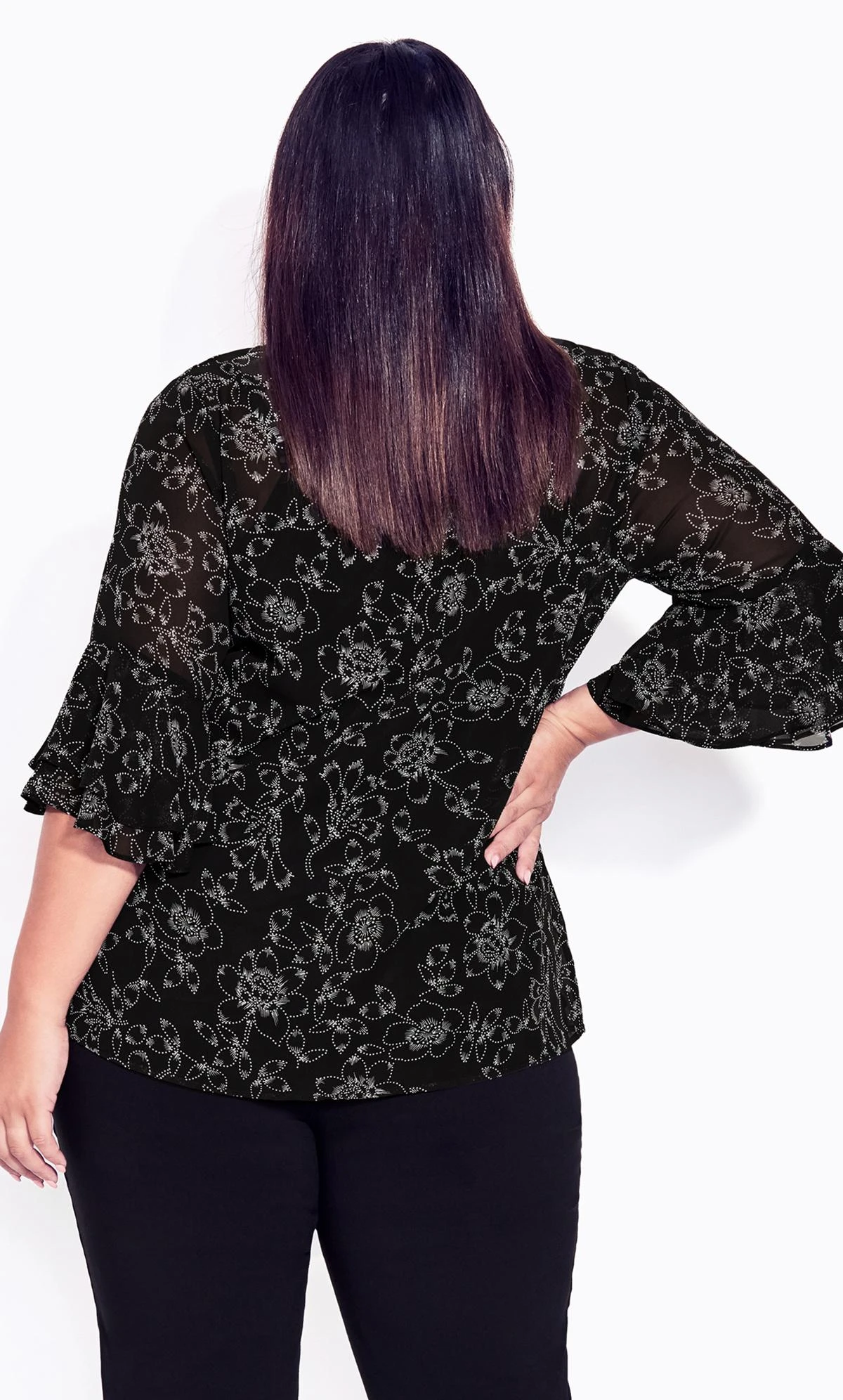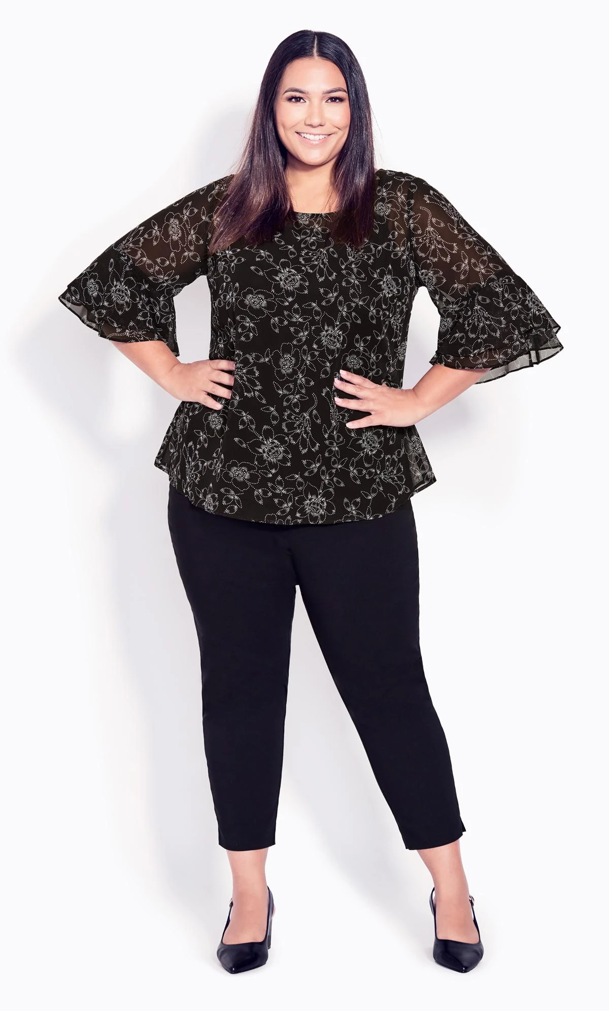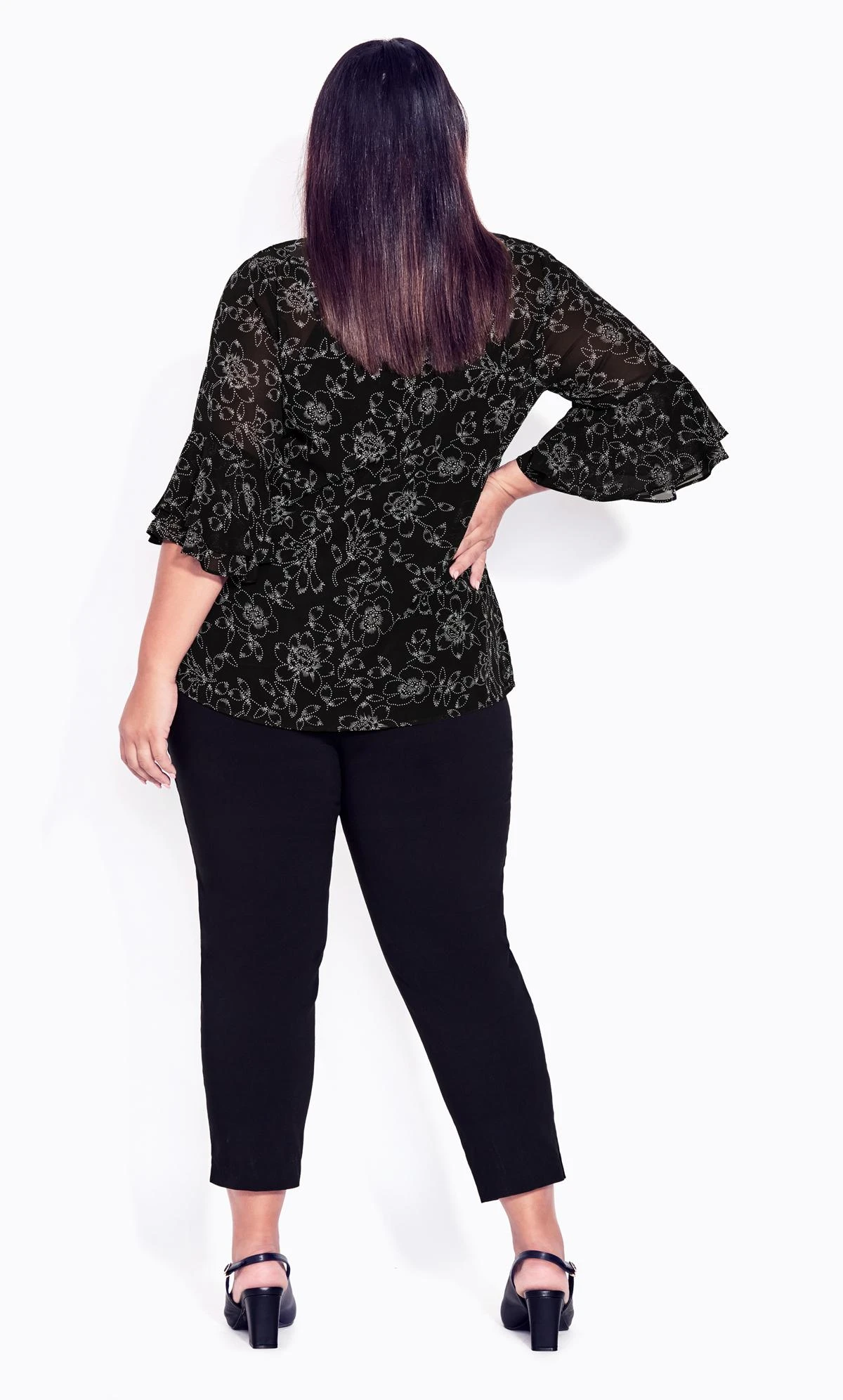 Embrace floral elegance with the Avenue Black Floral Flare Sleeve Blouse. The captivating floral print and stylish flare sleeves create a chic look. Versatile for day or night, this blouse effortlessly combines femininity and modern style, making it a must-have piece to enhance your ensemble with a touch of grace