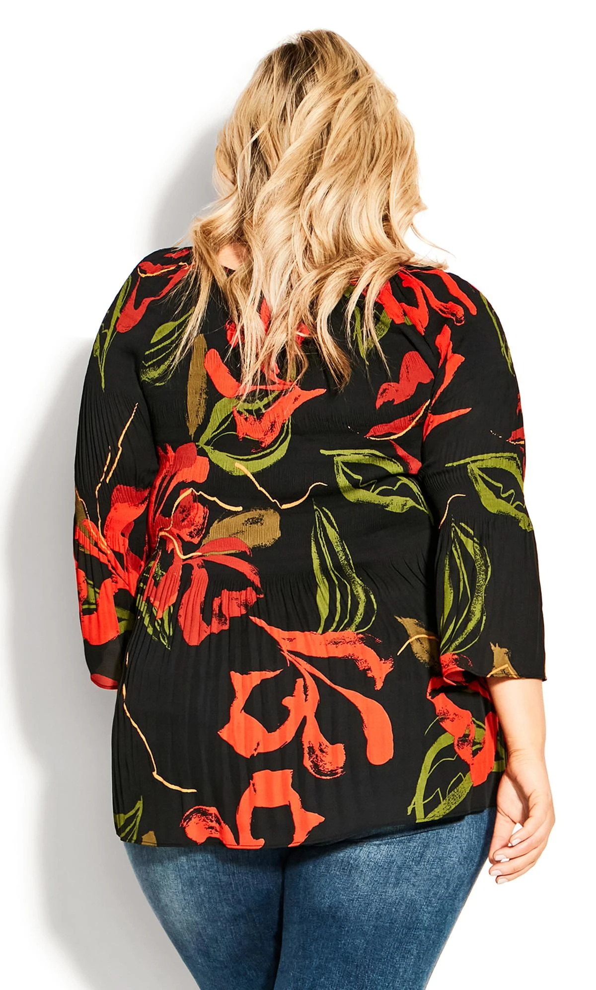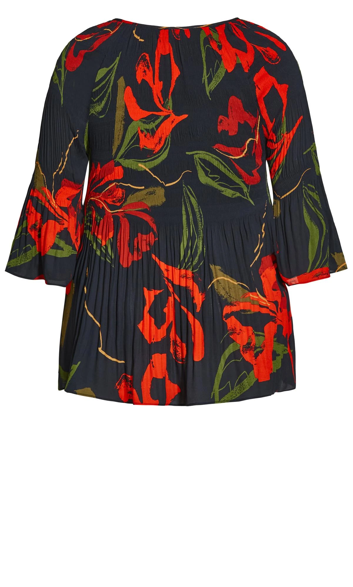 – Long bell flare pleat sleeves