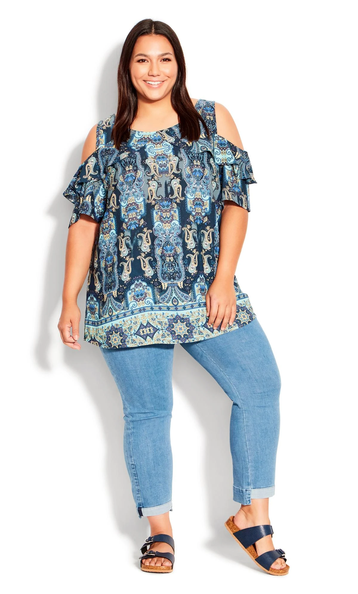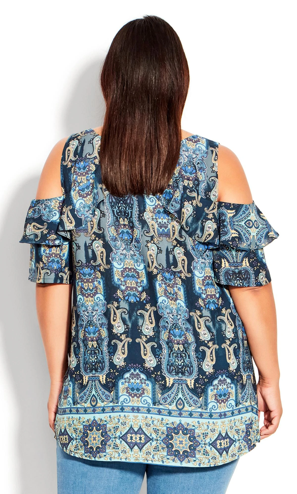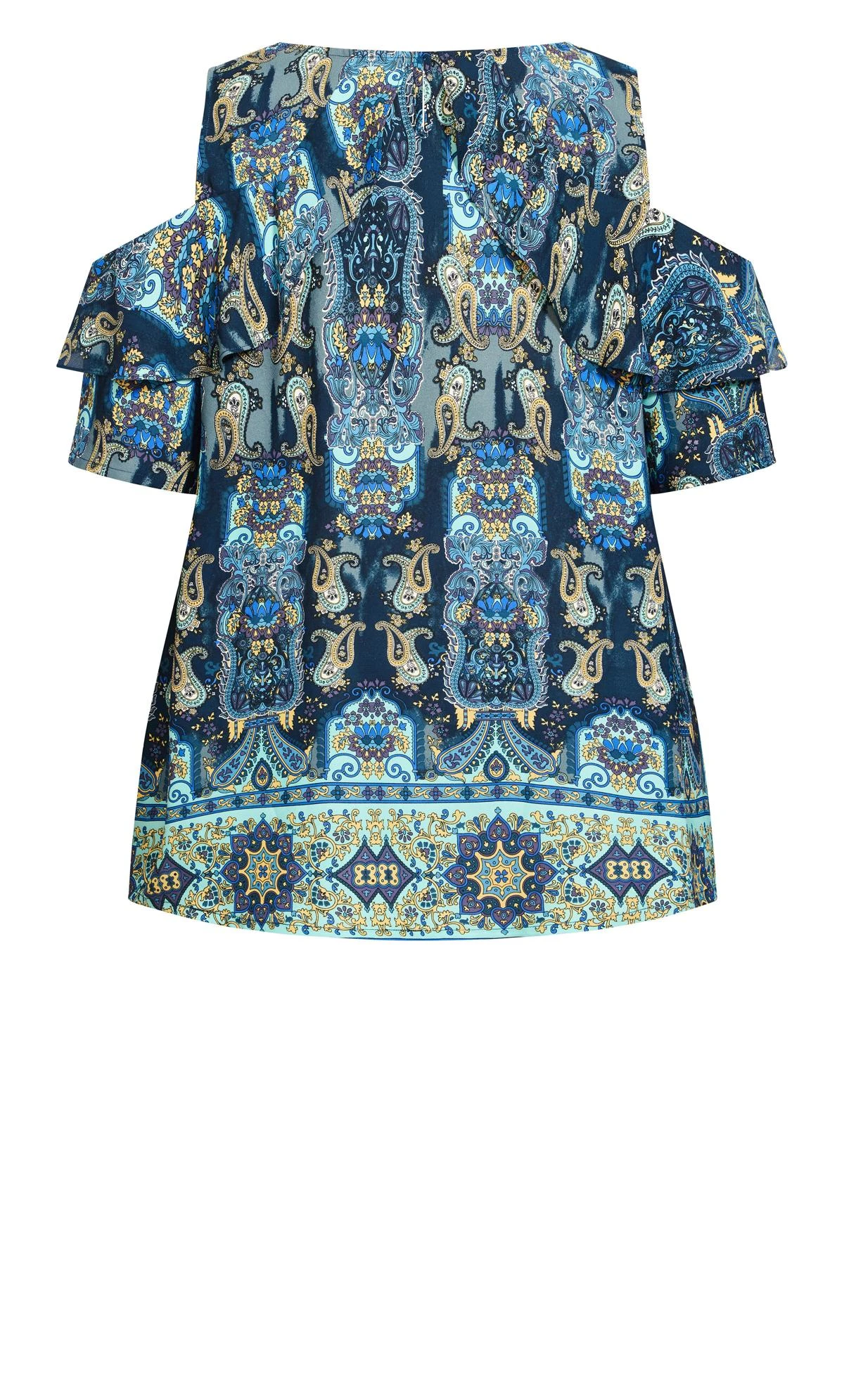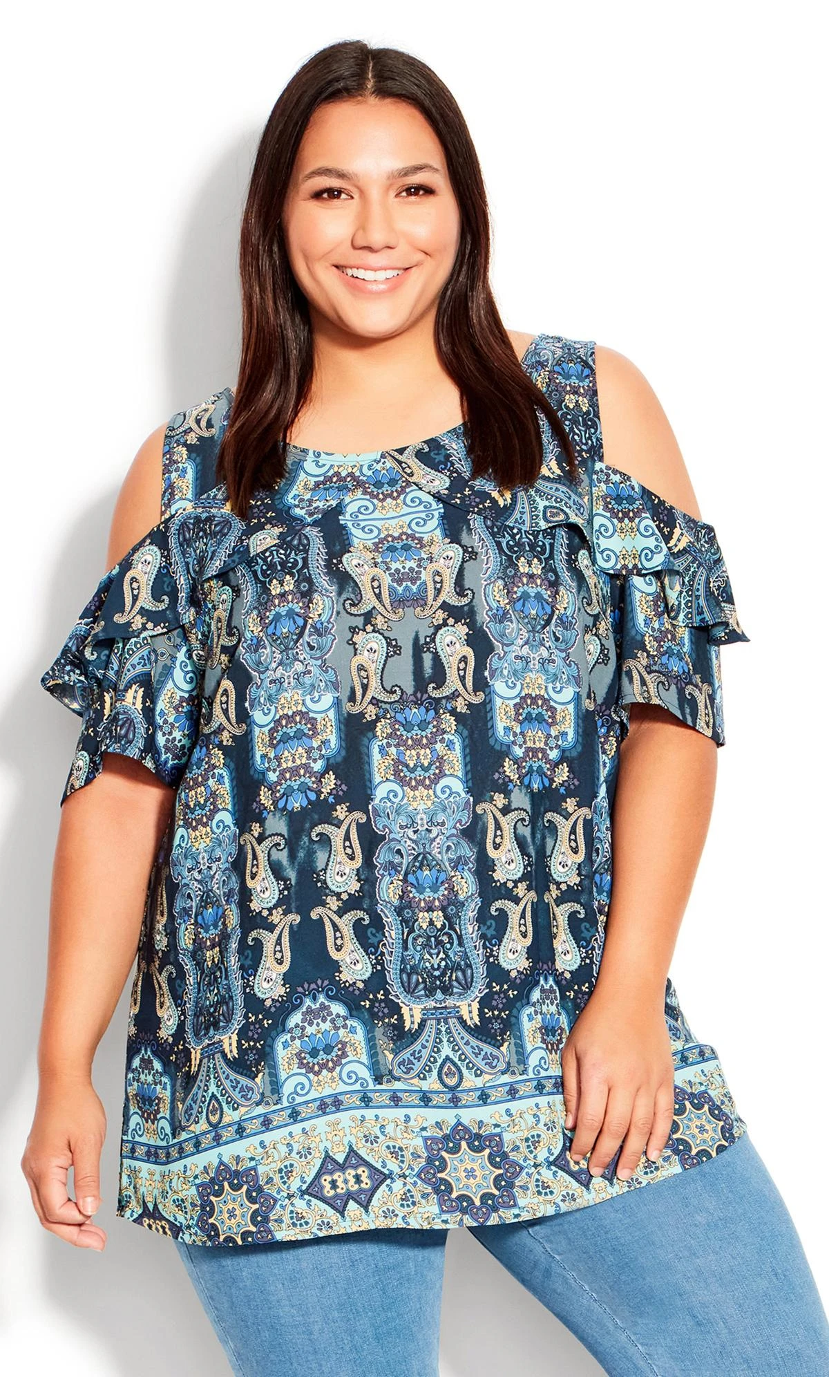 Elevate your style with the Avenue Blue Paisley Print Cold Shoulder Top. This top effortlessly merges chic and comfort, showcasing a captivating blue paisley print with trendy cold shoulder detailing. The intricate design adds a touch of bohemian charm to your outfit, making it versatile for both casual outings and more dressed-up occasions. Embrace the playful elegance of this top that seamlessly blends comfort and modern flair, becoming a must-have addition to your fashion repertoire.
