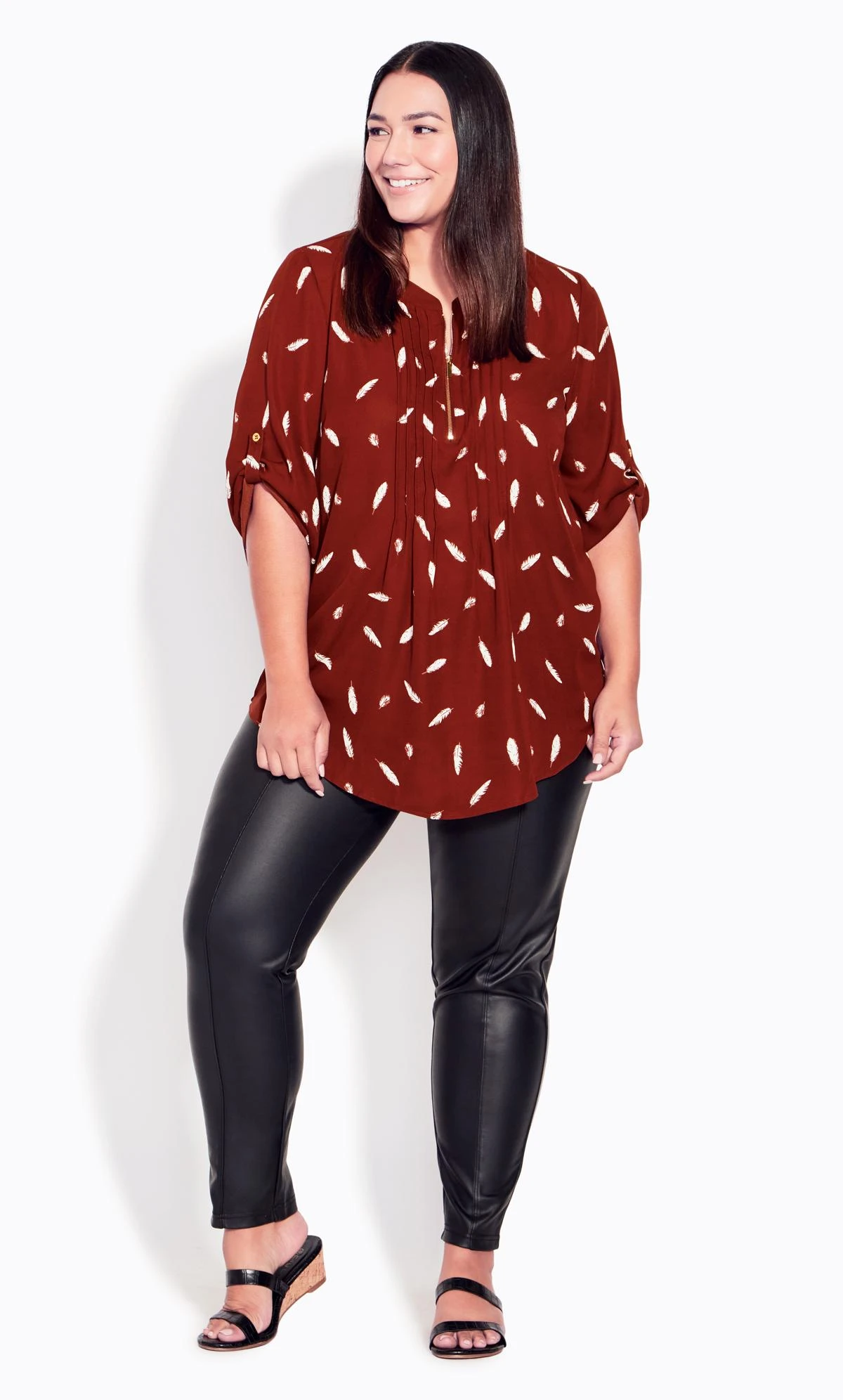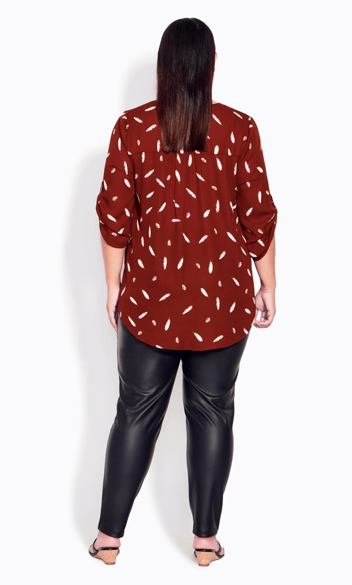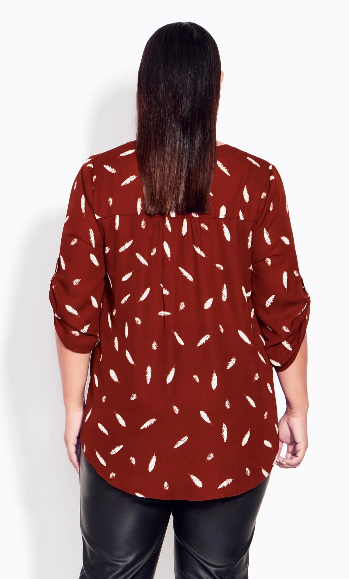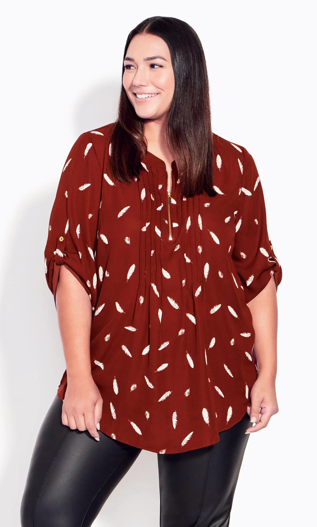 Revitalize your wardrobe with the Avenue Burgundy Red Feather Print Zip Neck Shirt. This shirt exudes modern style and sophistication, featuring a captivating feather print in burgundy red hues. The unique zip neck detail adds a contemporary edge, making it a versatile piece that effortlessly transitions from day to night. Elevate your fashion game with this statement shirt that combines comfort and flair in one stunning package.