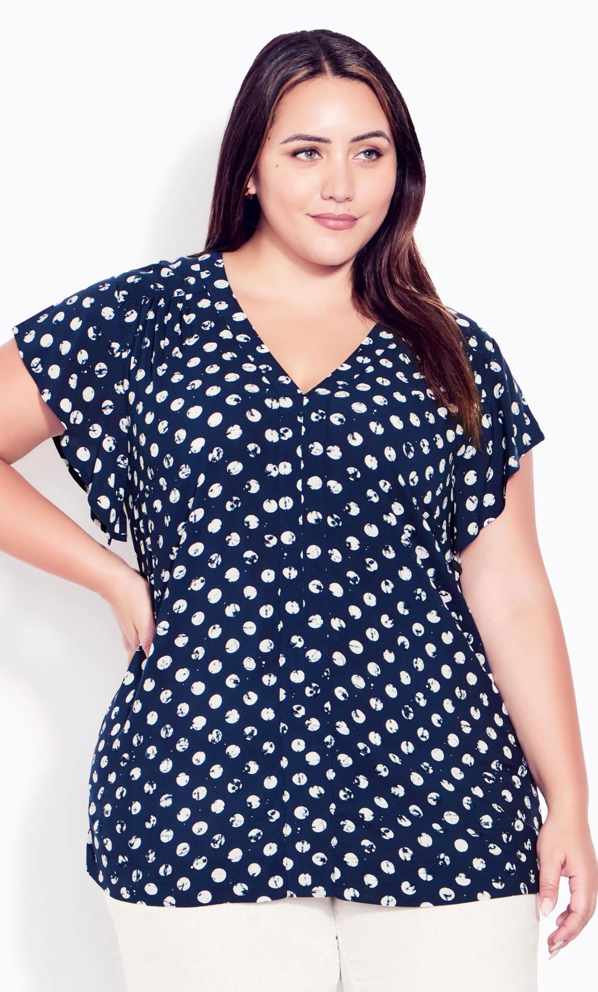 Dive into a timeless style with the Evans Navy Blue Polka Dot Print V-Neck Blouse. Featuring a classic polka dot print set against a rich navy blue background, this blouse effortlessly combines playful charm with sophisticated elegance. The flattering V-neck and soft, flowing fabric make it a versatile addition to any wardrobe, perfect for work or casual outings.
