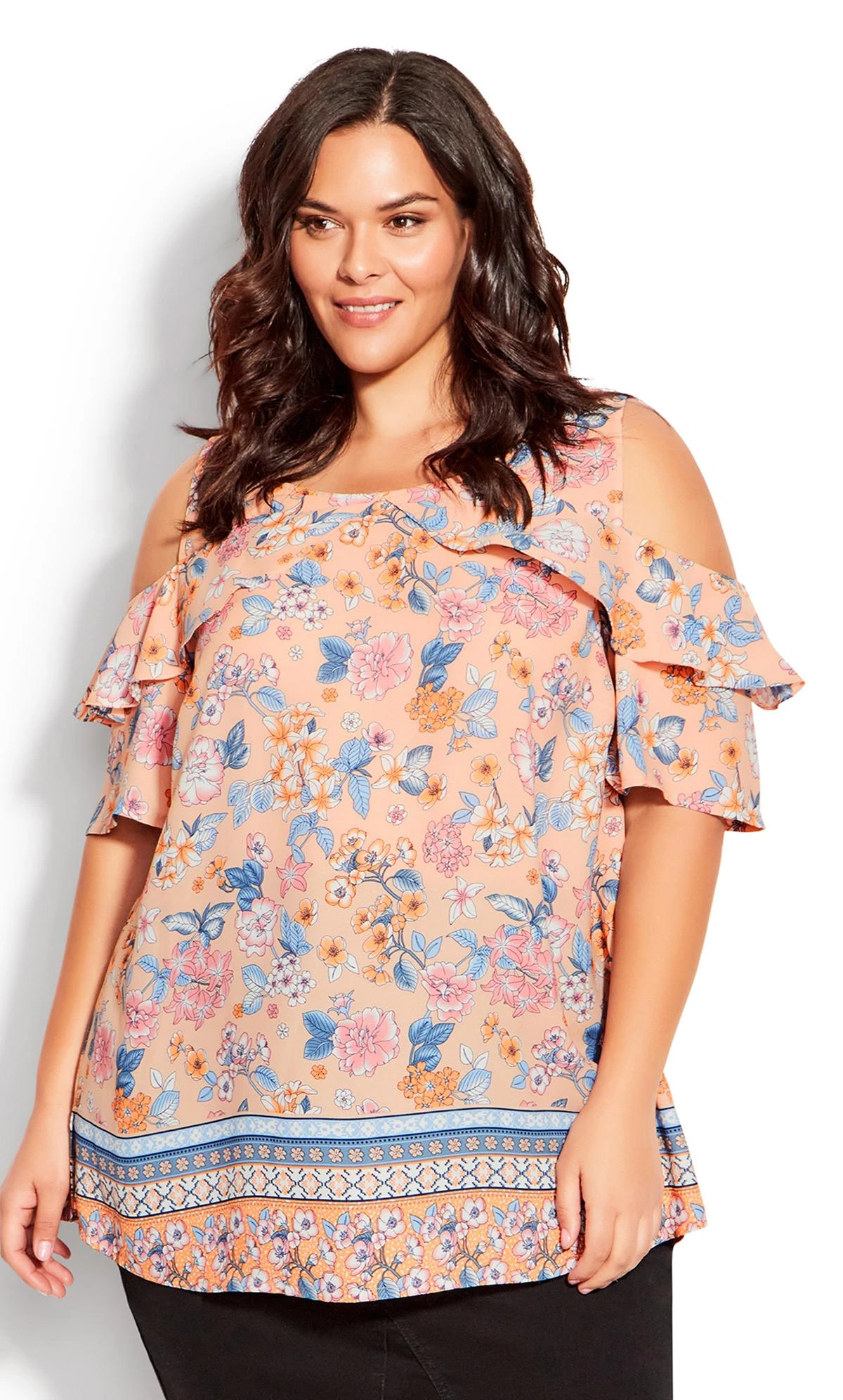 Embrace the romance of spring with the Evans Pink Floral Print Cold Shoulder Top. Set against a dreamy pink hue, the vibrant floral motifs are accentuated by alluring cold-shoulder details, blending timeless elegance with a touch of modern flair.