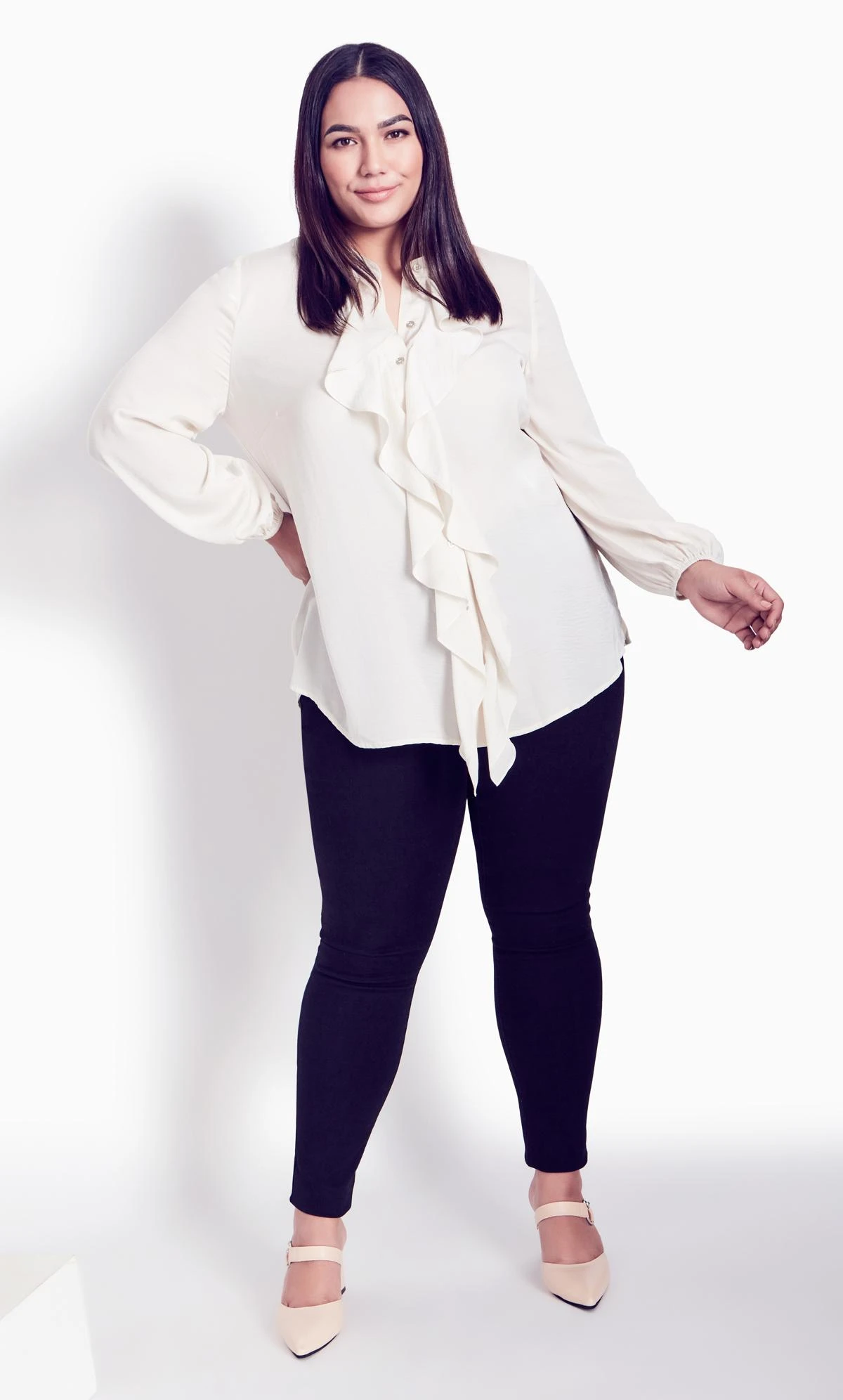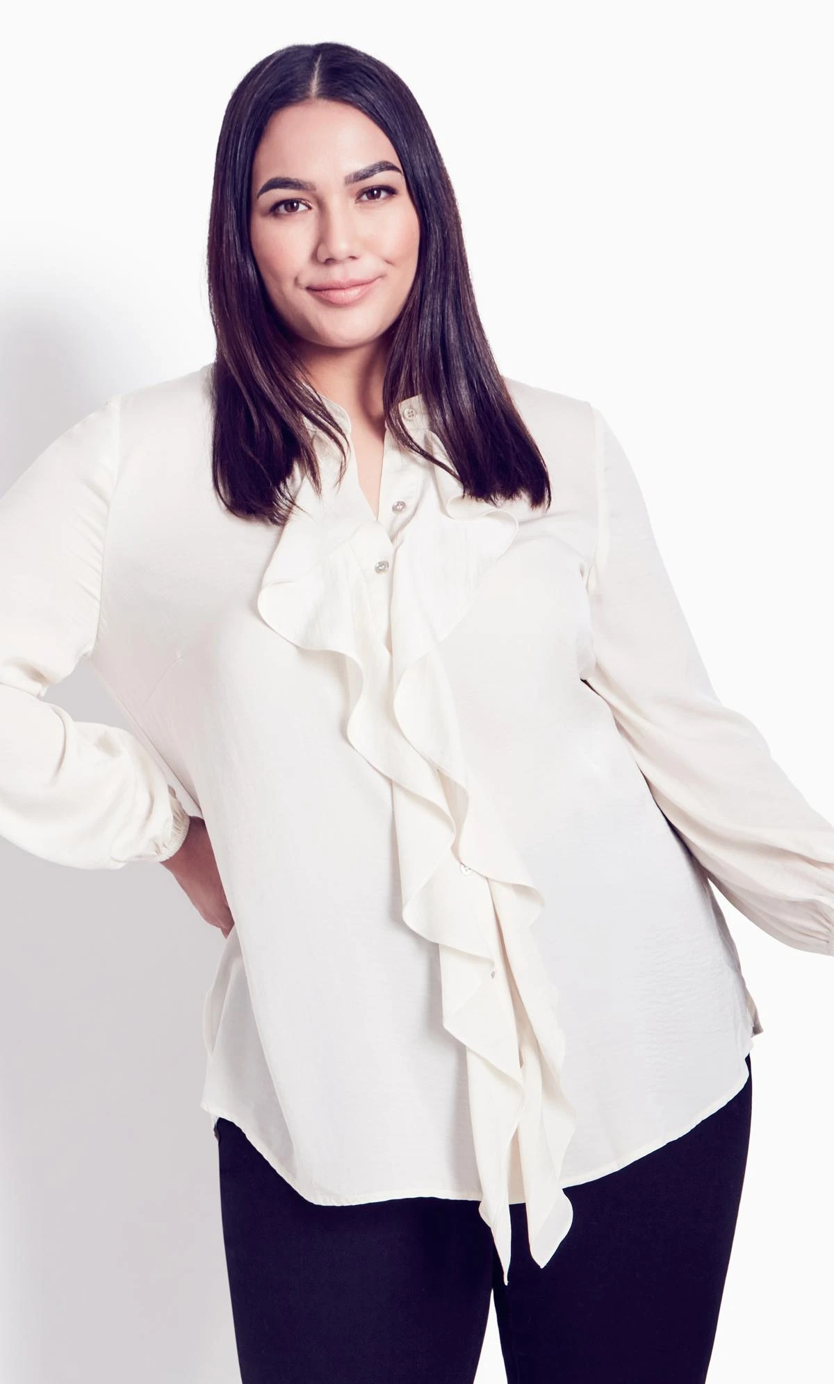 Elevate your ensemble with Avenue’s Ivory Ruffle Long Sleeve Blouse. This blouse effortlessly blends charm with delicate ruffle detailing, featuring a classic white design. Whether paired with jeans or skirts, embrace both elegance and style with this versatile piece.