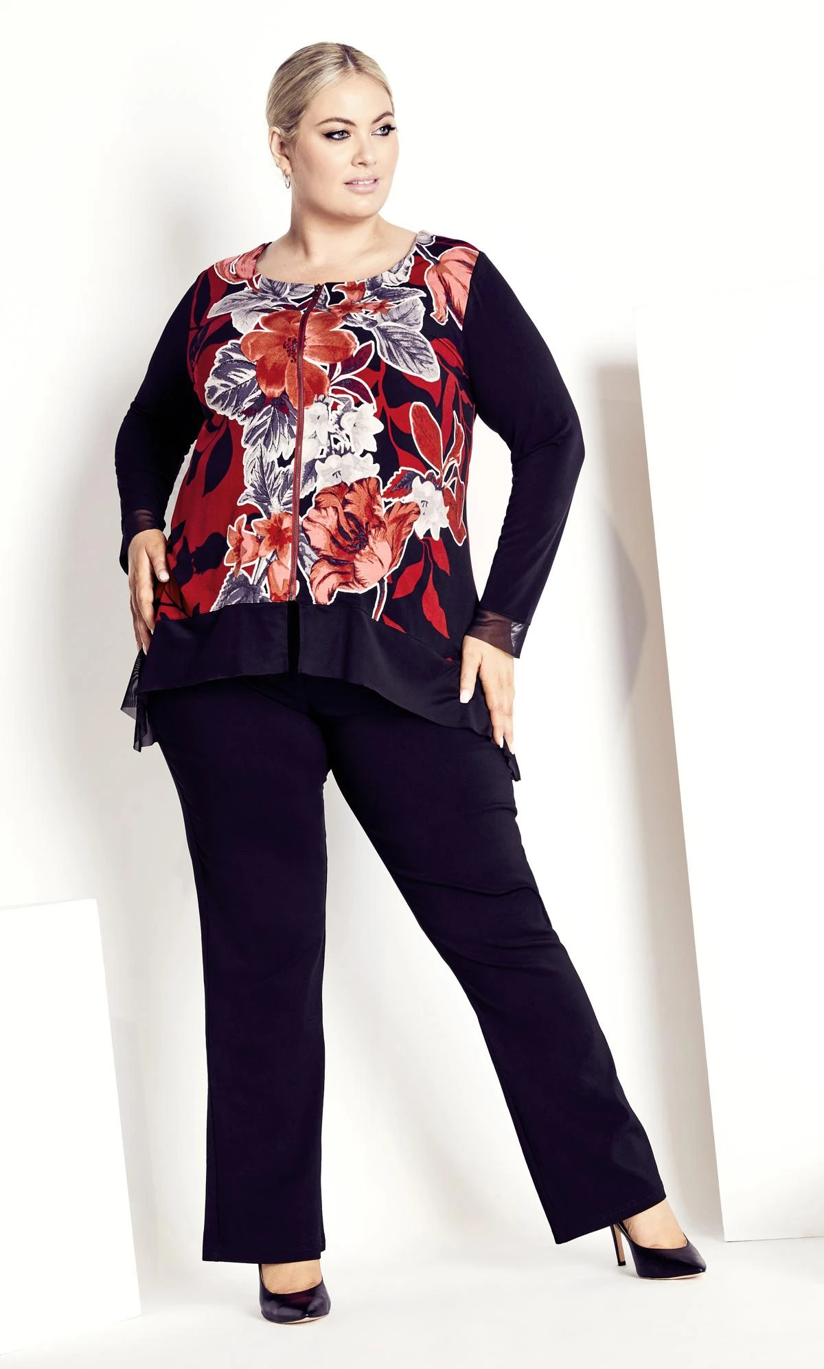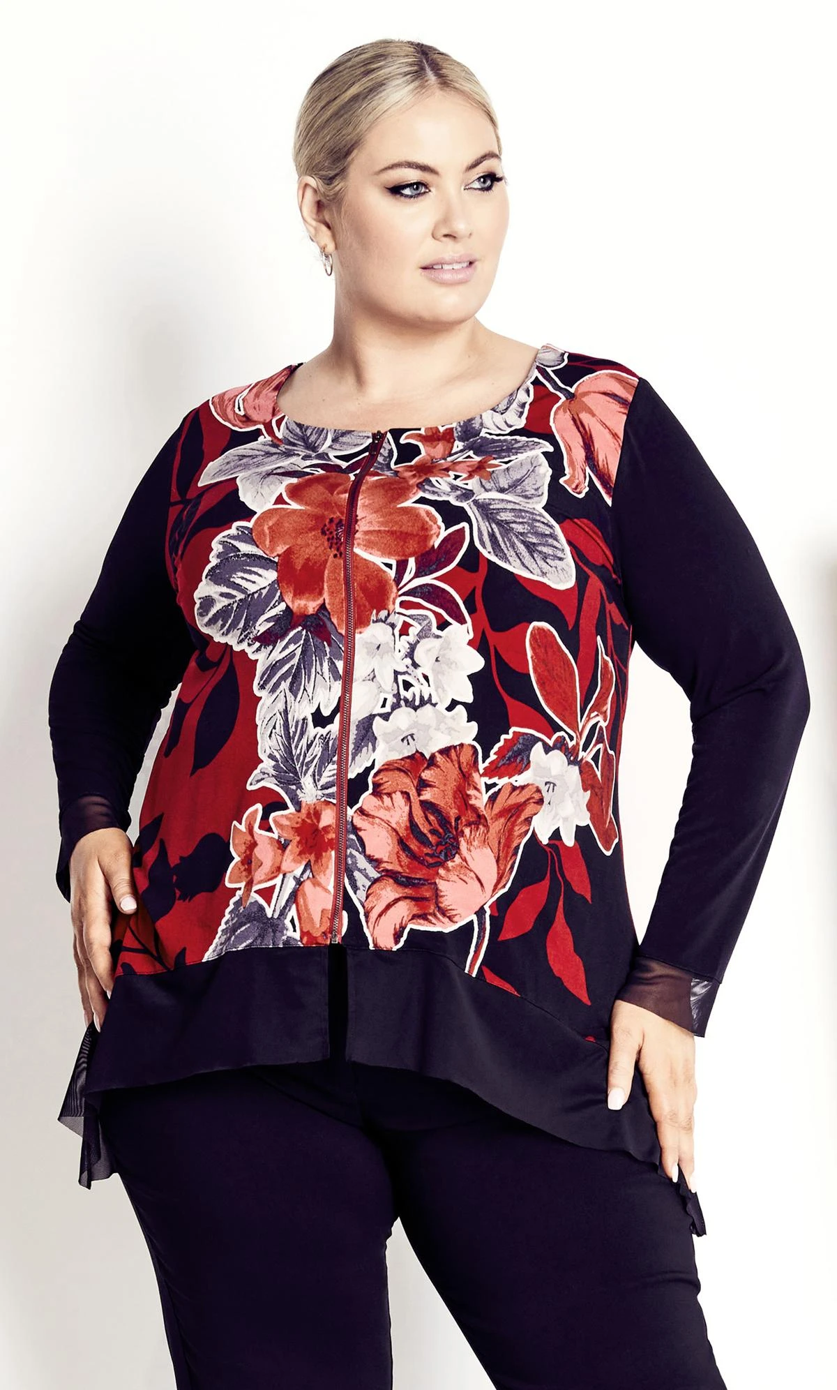 Discover versatile elegance with the Avenue Navy Blue Floral Print Zip Through Blouse. The rich navy blue backdrop showcases a delicate floral print, while the zip-through design adds a modern touch to this timeless piece. Effortlessly transition from day to night with this blouse, a perfect blend of style and convenience for any occasion.