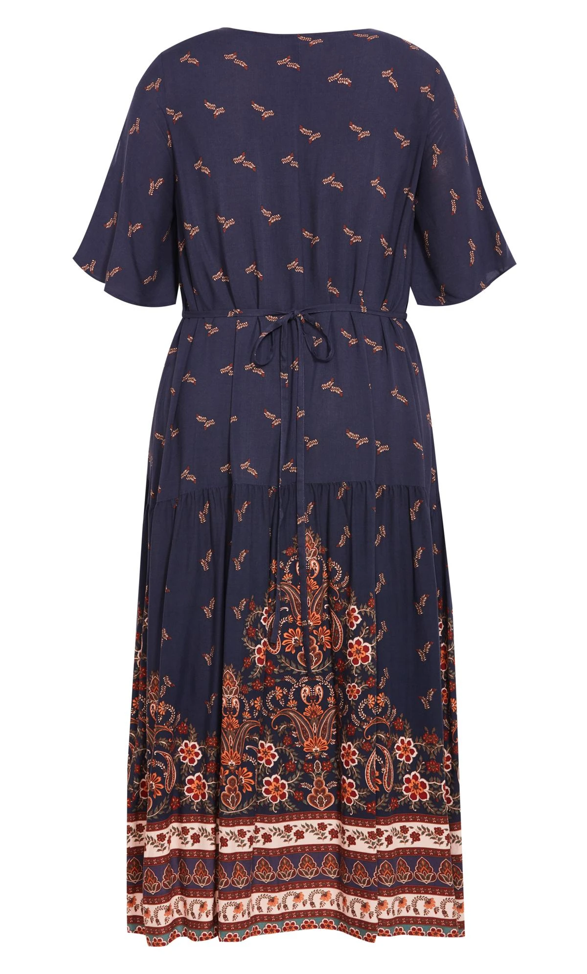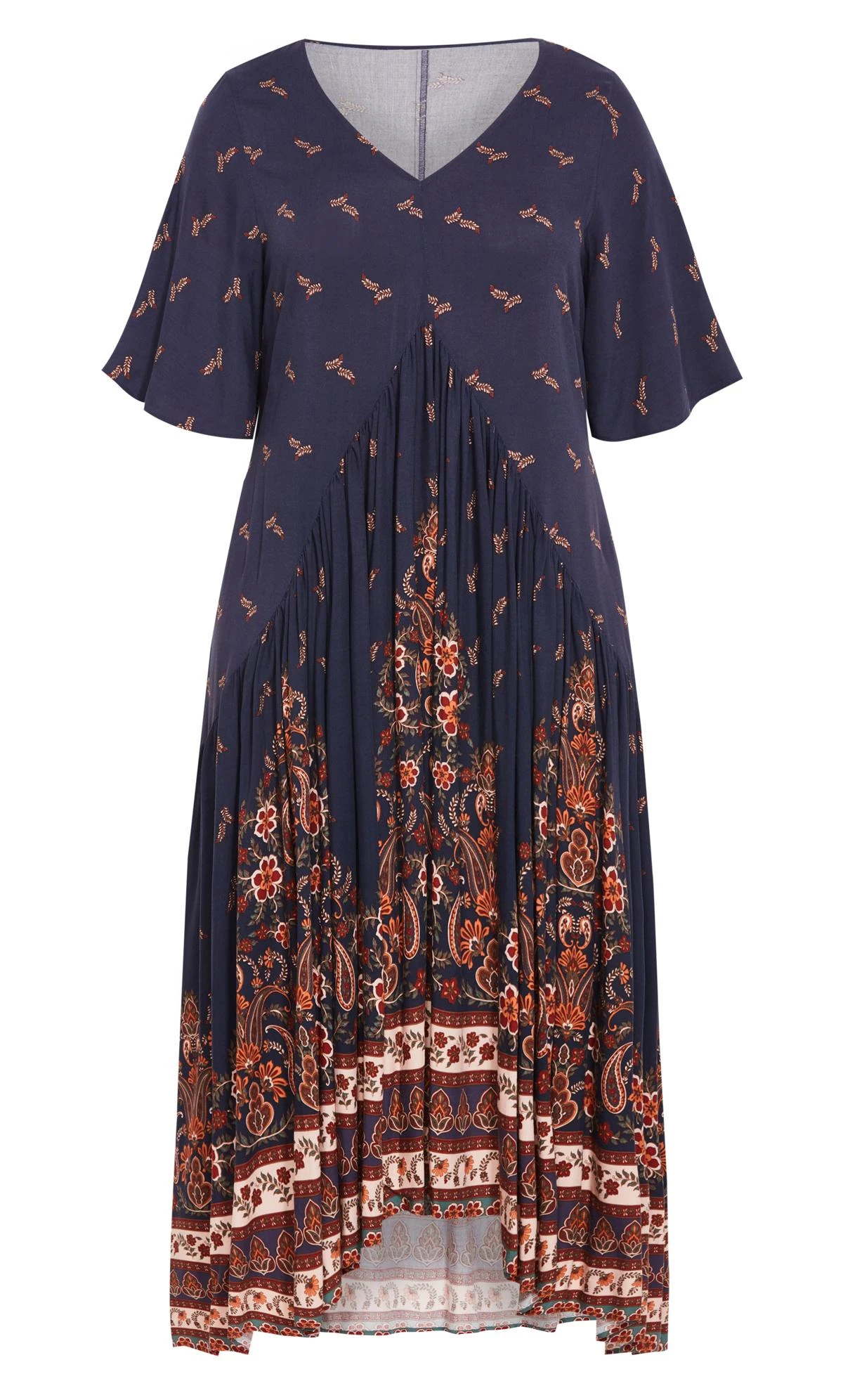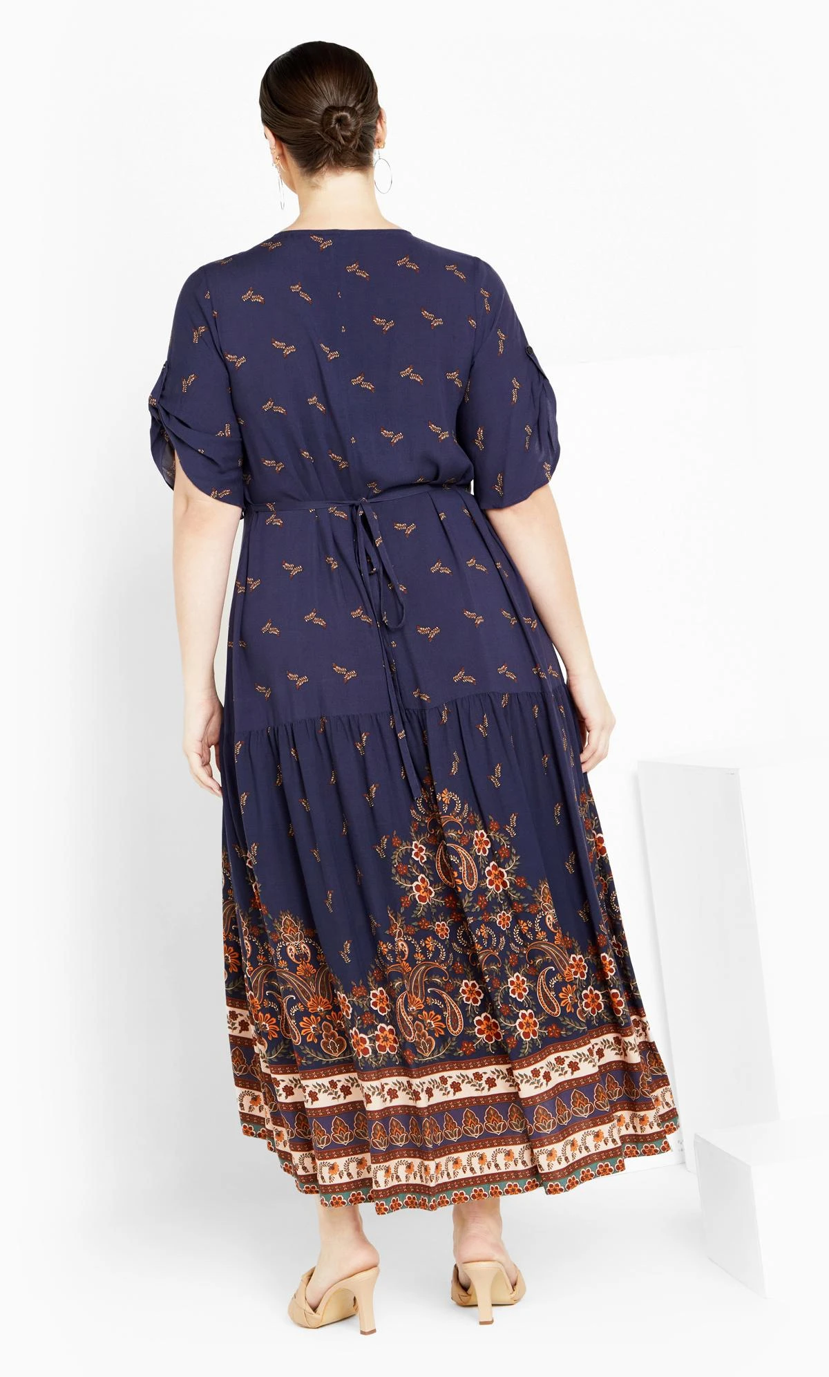 Elevate your style with the exquisite Avenue Navy Blue Paisley Print Pleated Maxi Dress. Crafted with meticulous attention to detail, this dress boasts a captivating navy blue hue adorned with a timeless paisley print. The elegant pleated design adds depth and movement, making it a perfect choice for both casual gatherings and sophisticated events.