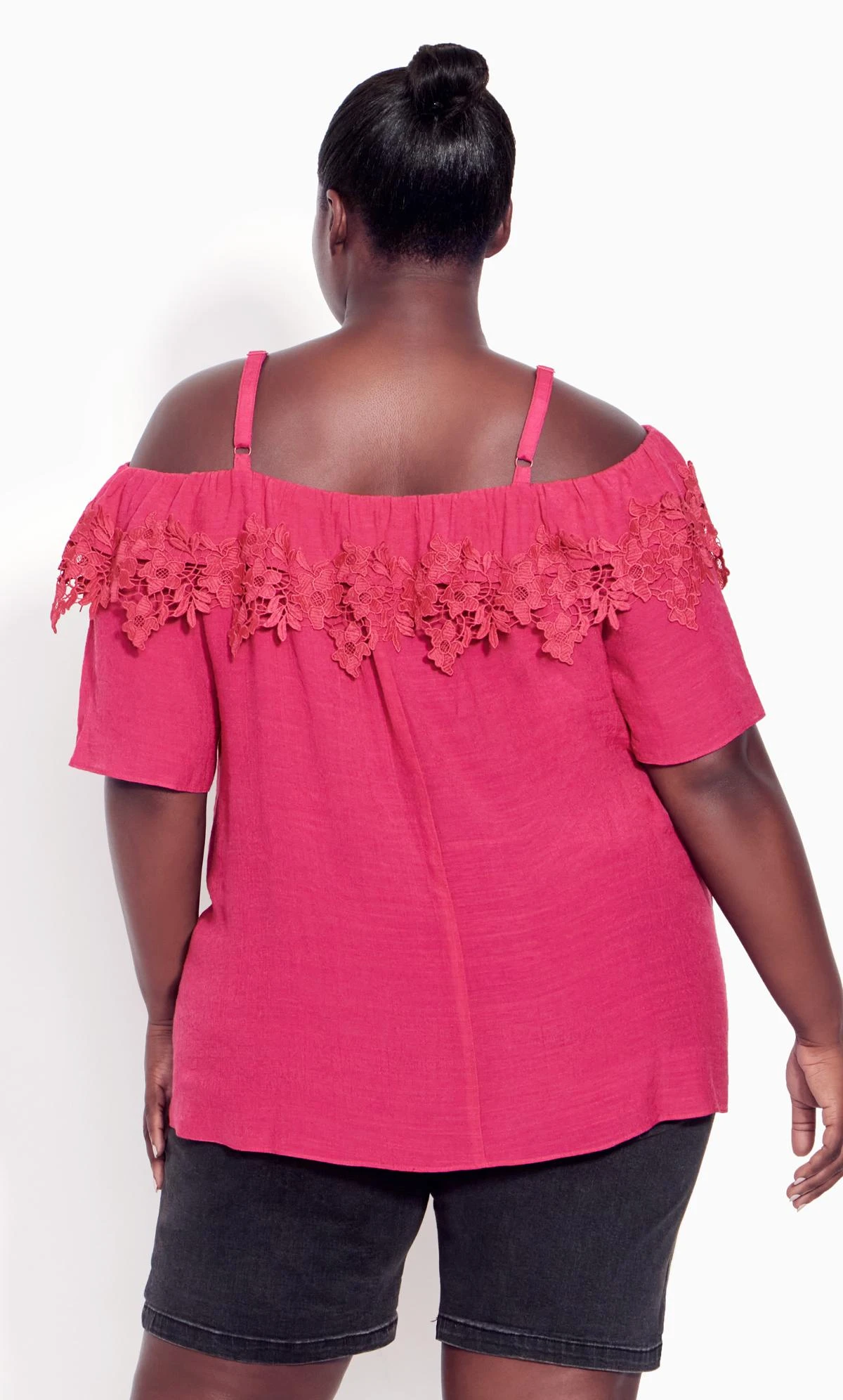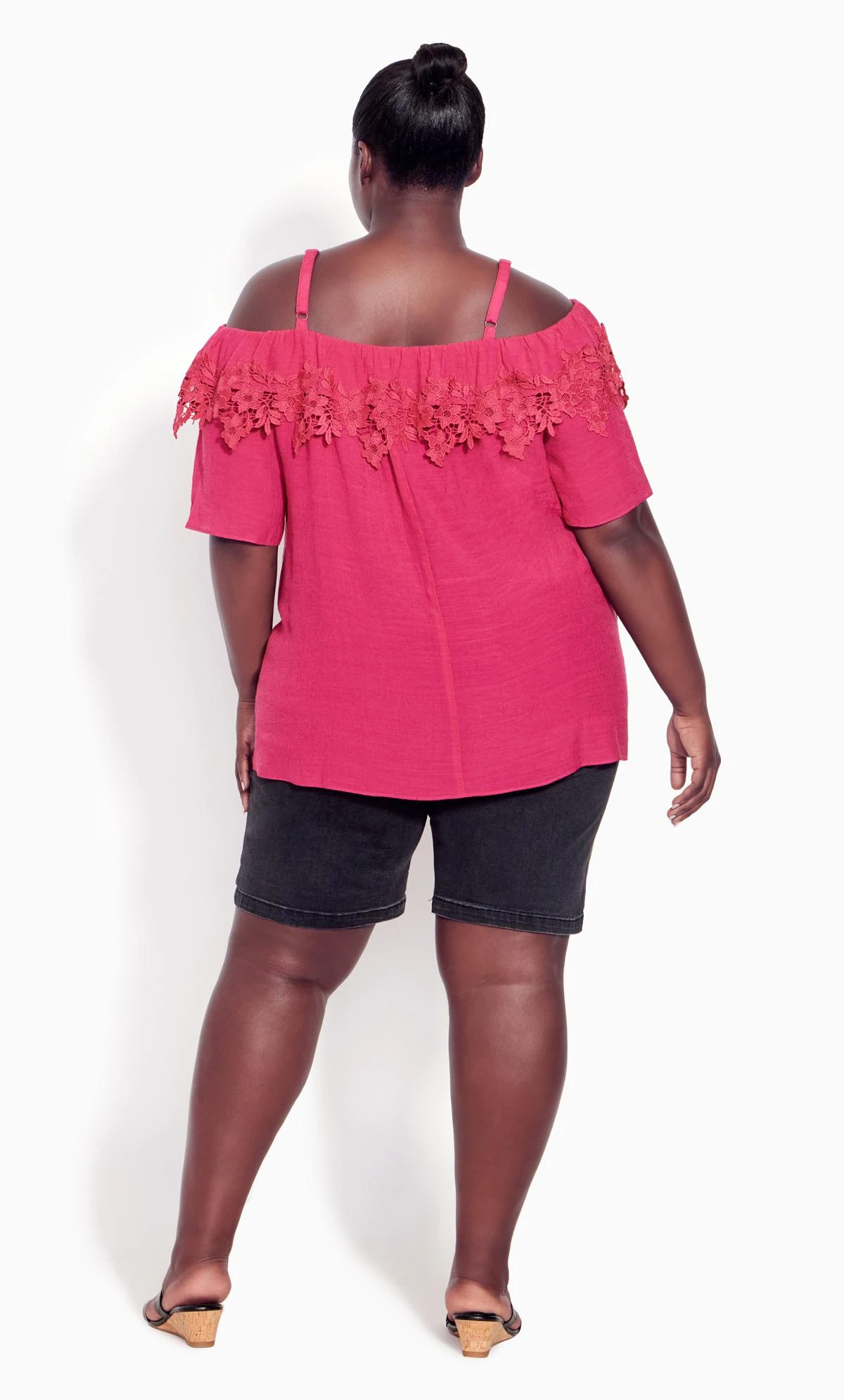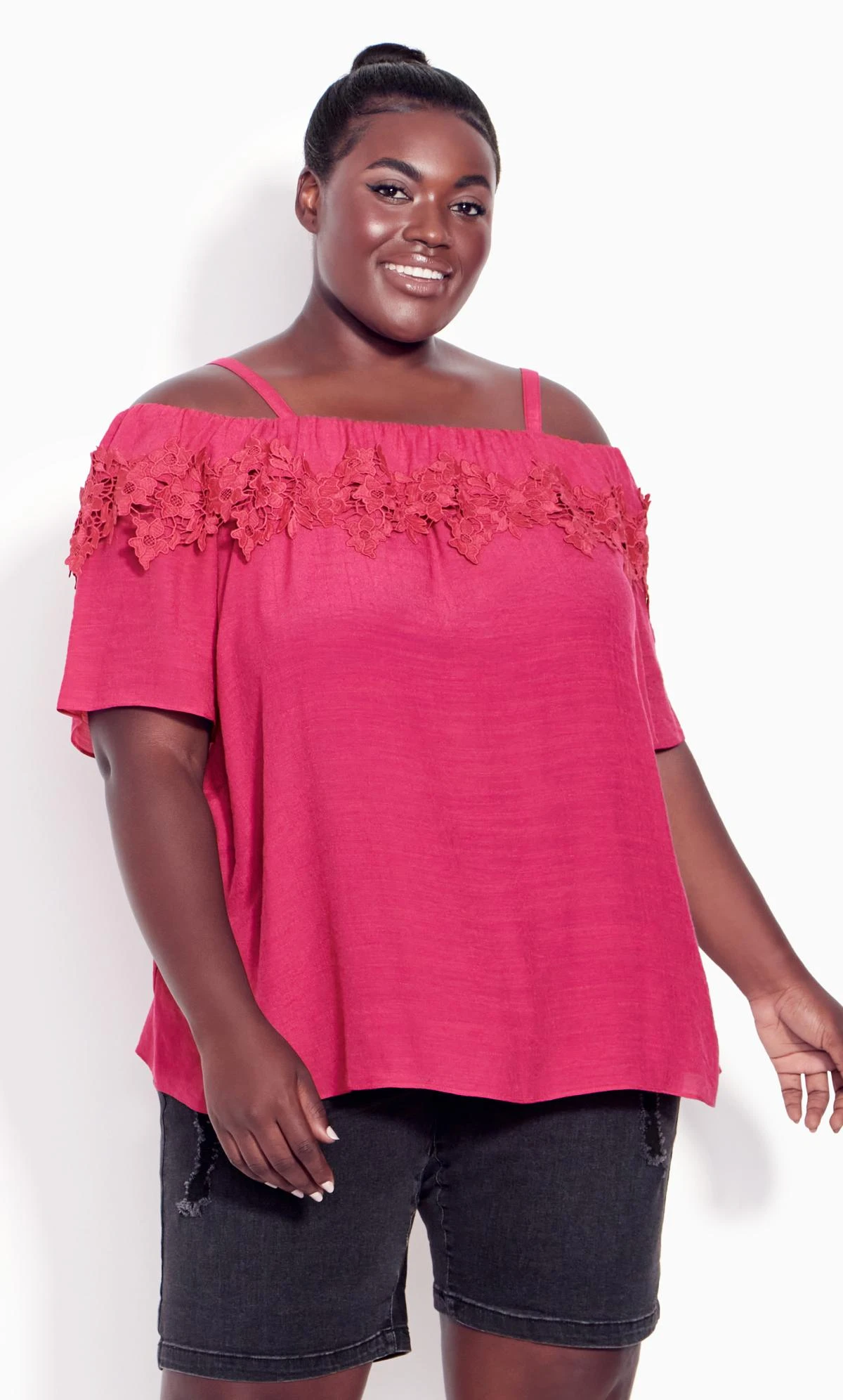 Avenue’s Pink Lace Detail Bardot Top offers feminine elegance and style. The top effortlessly blends charm with delicate lace detailing and a flattering Bardot neckline. Whether for daytime outings or evening occasions, embrace grace and trendiness with this versatile piece.