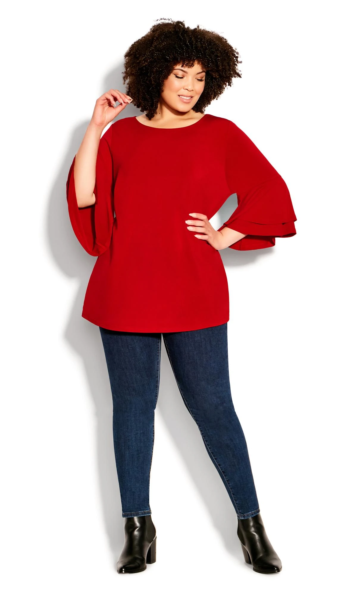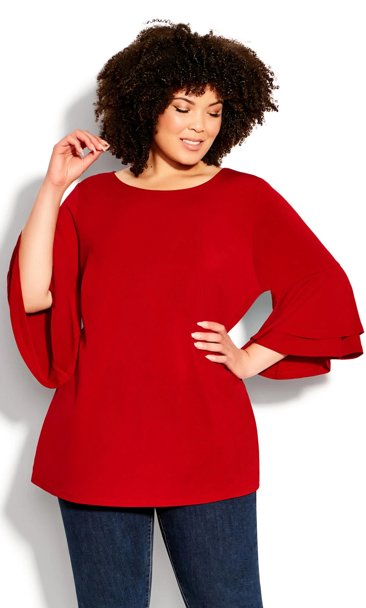 Radiate in the exquisite design of the Avenue Red Flare Sleeve Blouse. This stunning blouse, in a captivating red hue, is accentuated by its dramatic flare sleeves, adding a touch of theatrical elegance to your ensemble. Perfect for moments when you want to stand out, its unique silhouette ensures a memorable, stylish statement.