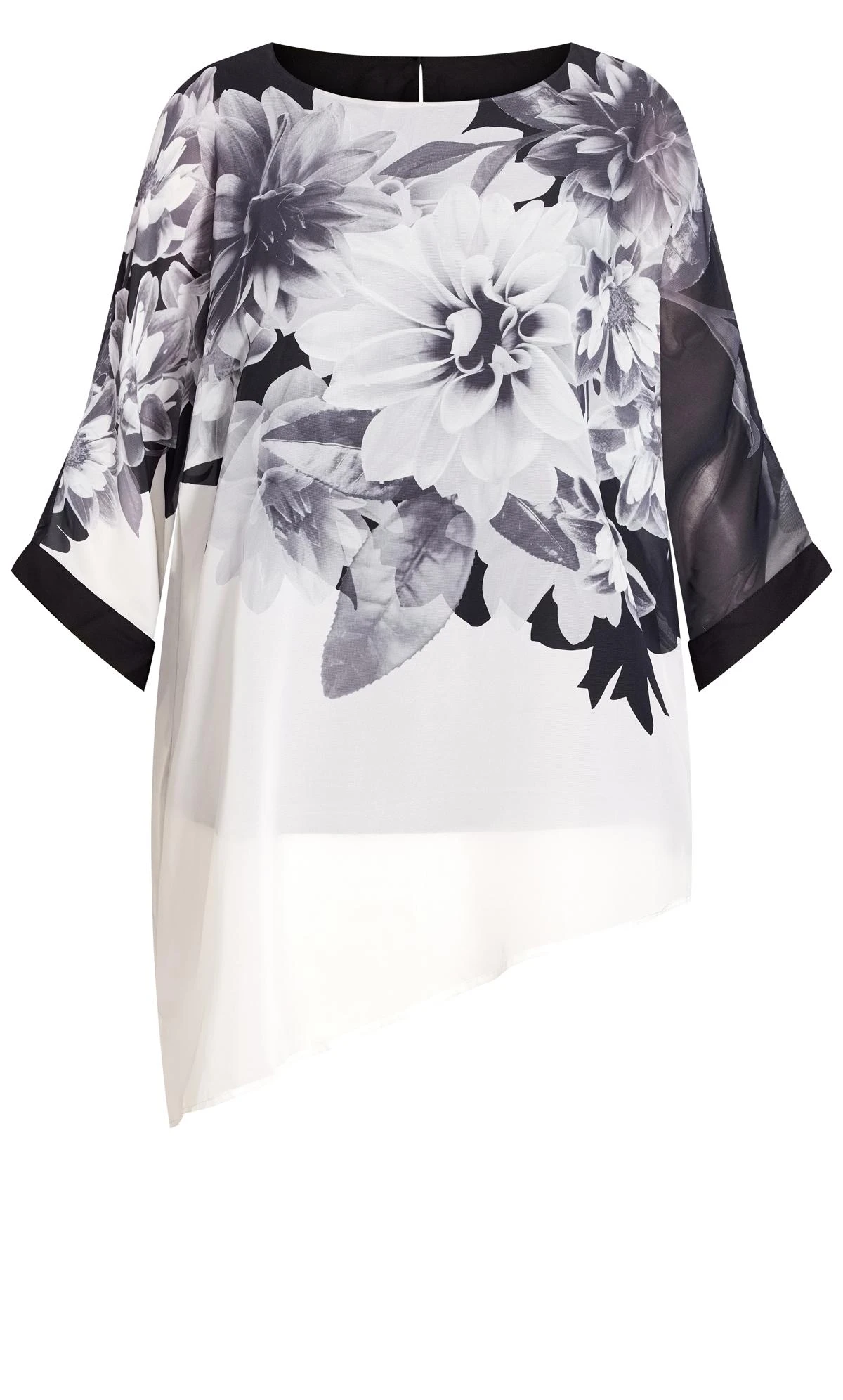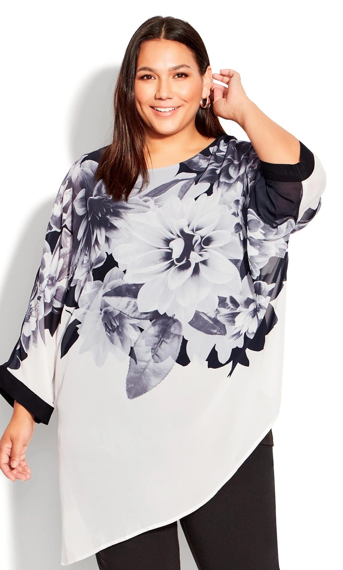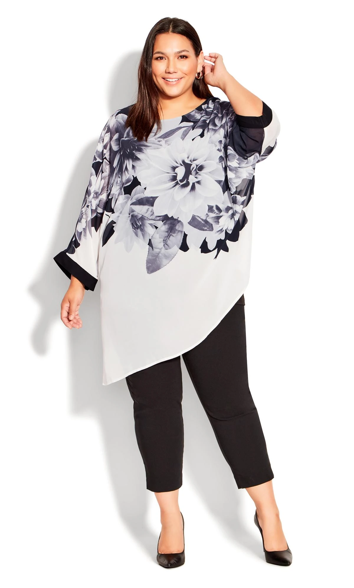 Elevate your ensemble with the Avenue White Floral Print Asymmetric Blouse. The captivating floral print dances against the crisp white background, adding a touch of natural beauty to your look. The asymmetrical design brings modern flair to the classic blouse, making it a versatile choice for both casual outings and more sophisticated occasions.