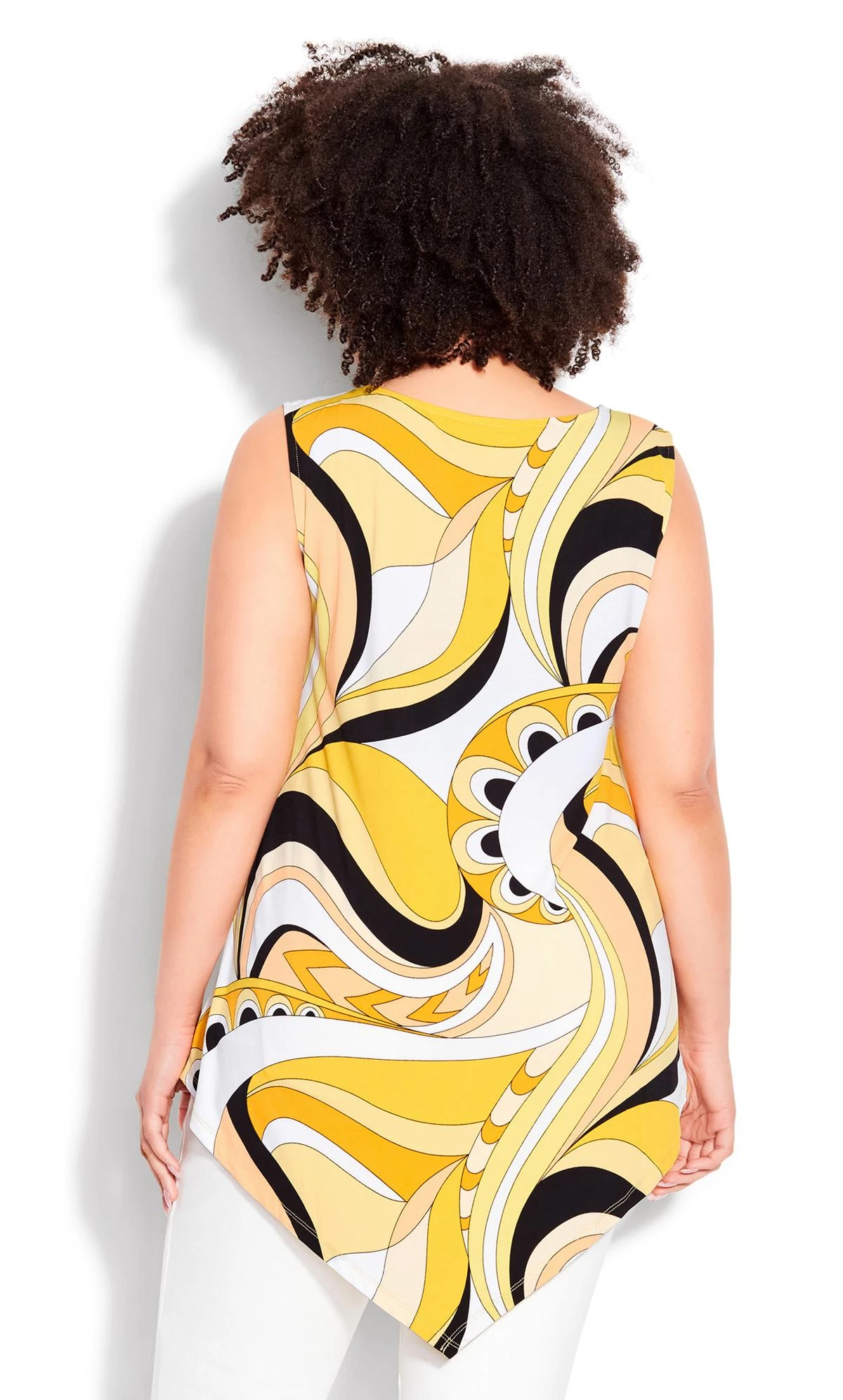Elevate your style with Avenue’s Yellow Swirl Hanky Hem Vest Top. The vibrant yellow swirl design meets a playful hanky hem, offering both comfort and trendiness. Versatile for various occasions, this vest top effortlessly combines casual charm with a touch of flair, making it a must-have addition to your collection for a fashionable and easygoing look.