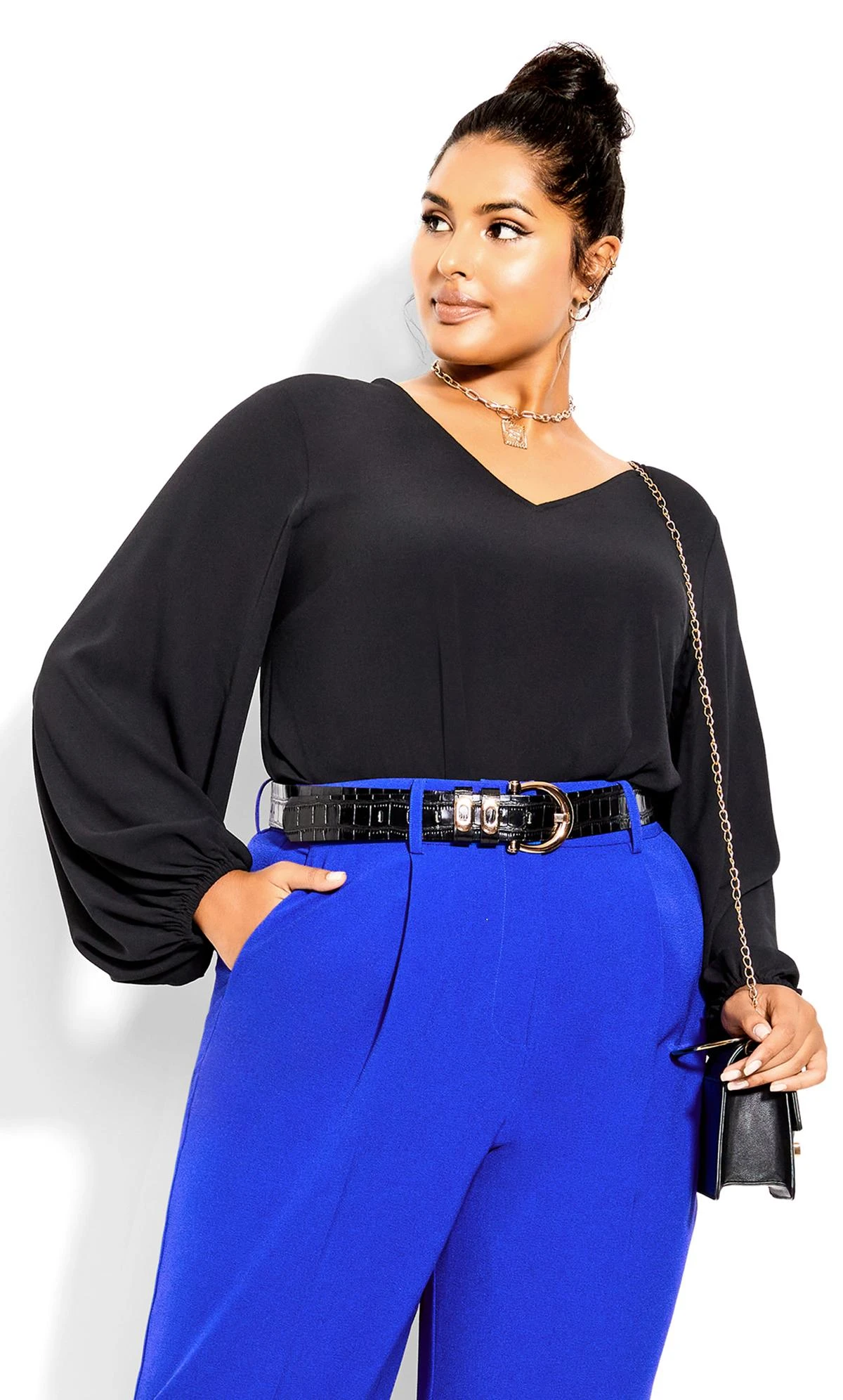 Experience contemporary chic with the City Chic Black Balloon Sleeve Top. The unique balloon sleeves add a touch of drama and style to this classic black top. Whether paired with jeans for a casual outing or a skirt for a dressed-up look, this top promises a statement-making ensemble that’s effortlessly elegant.