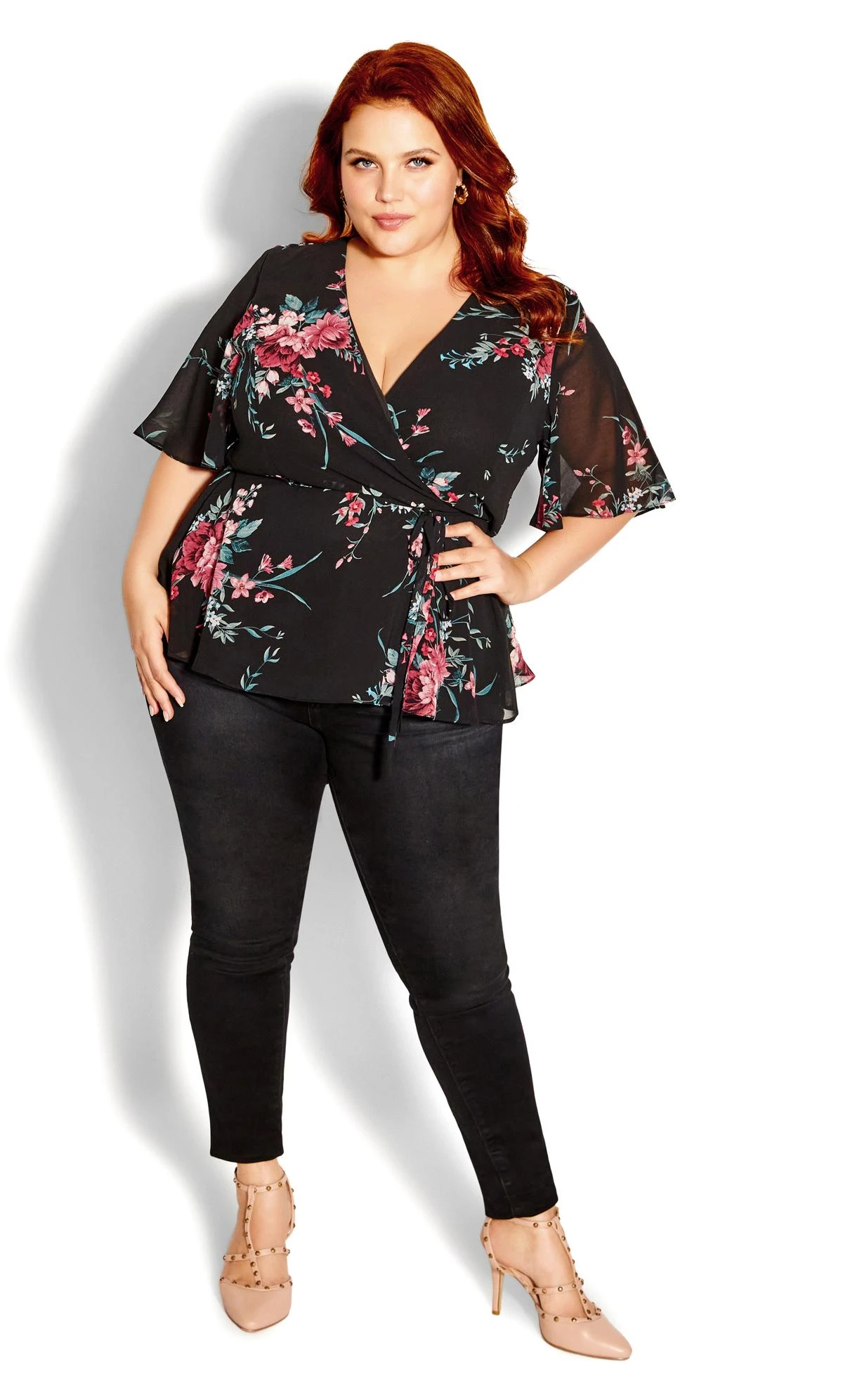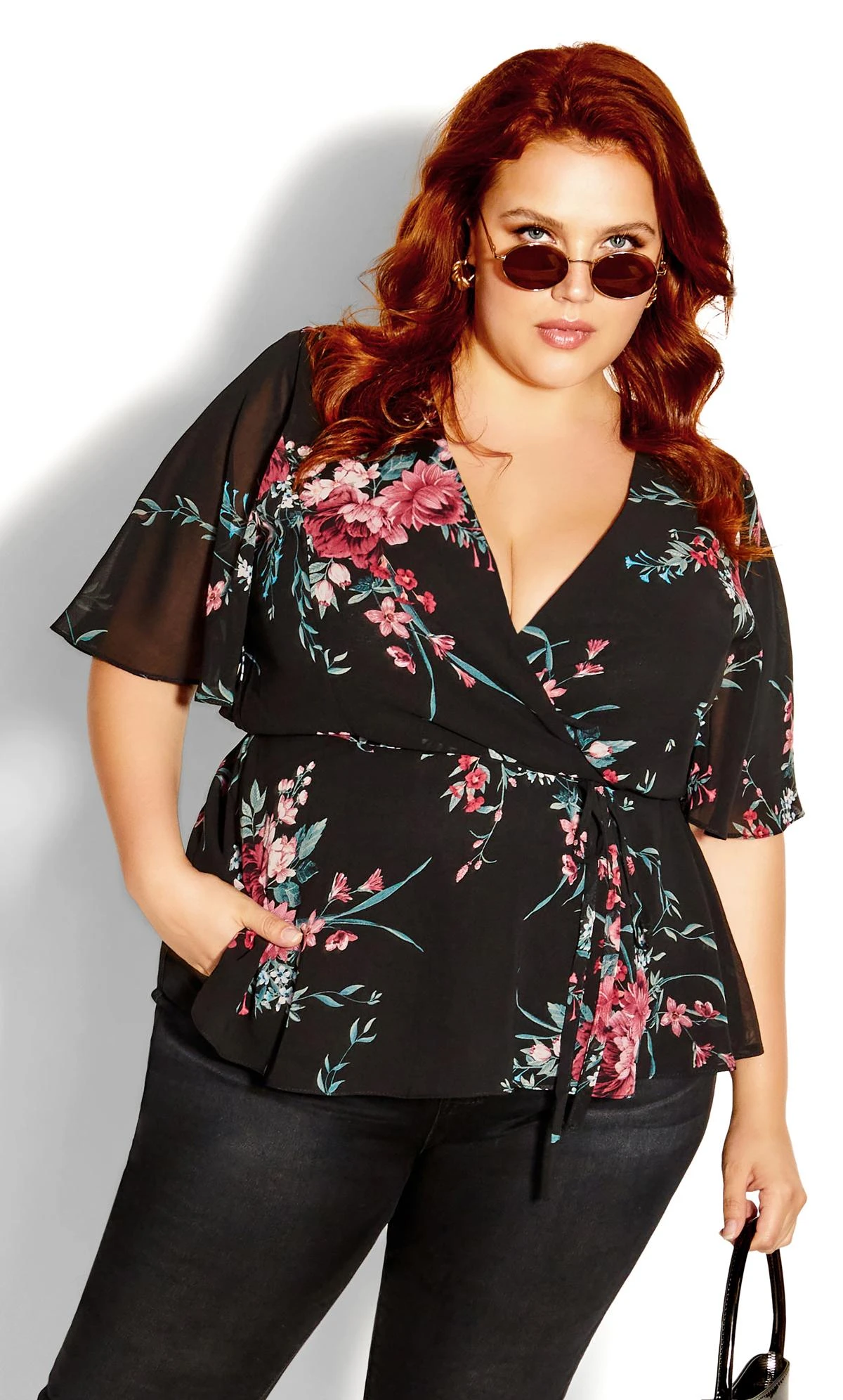 The City Chic Black Floral Print Chiffon Wrap Top offers a delicate dance of elegance and modern design. Set against a classic black chiffon, its vibrant floral print brings a touch of nature-inspired beauty to the ensemble. The wrap detail ensures a flattering fit, making this top a versatile choice for both daytime charm and evening sophistication, blossoming with style in every setting.