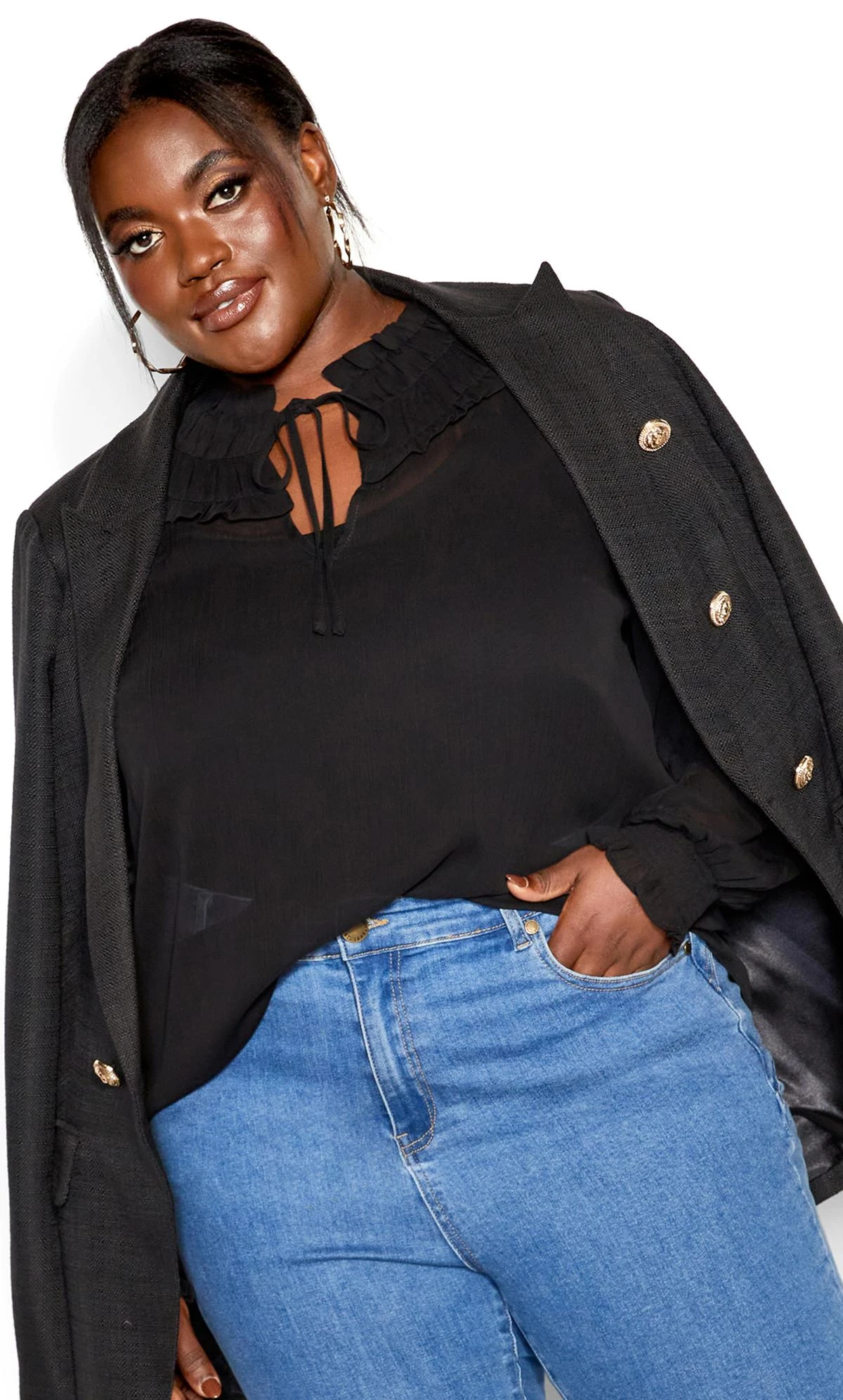 The City Chic Black Gypsy Top exudes bohemian charm with its flowing silhouette and timeless black color. Its off-the-shoulder design and intricate details add a touch of elegance to its relaxed style, making it a versatile choice for both casual and dressier occasions. Whether paired with jeans, shorts, or a maxi skirt, the City Chic Black Gypsy Top offers a chic and comfortable option for effortlessly stylish outfits.