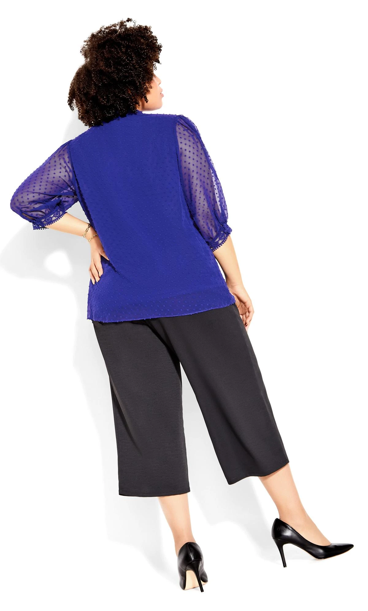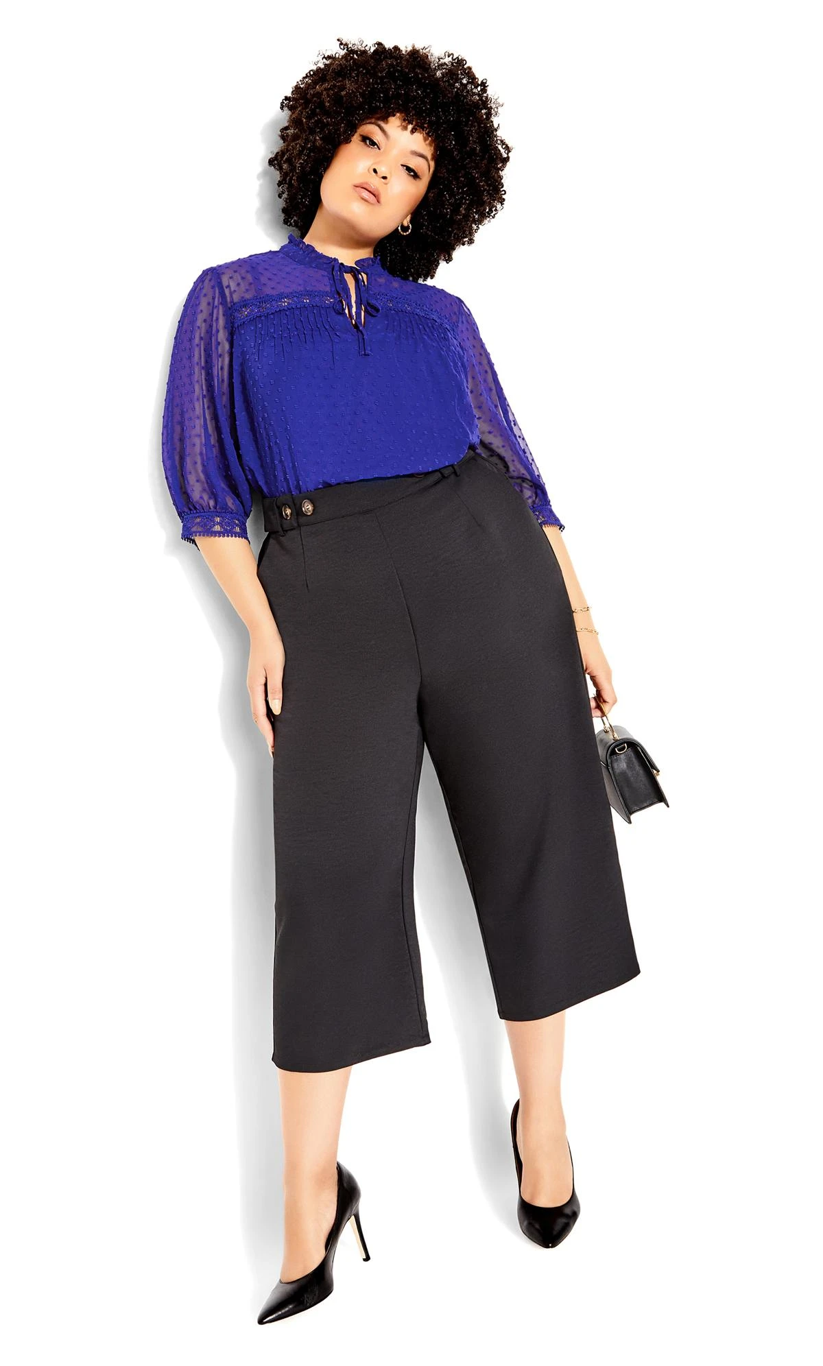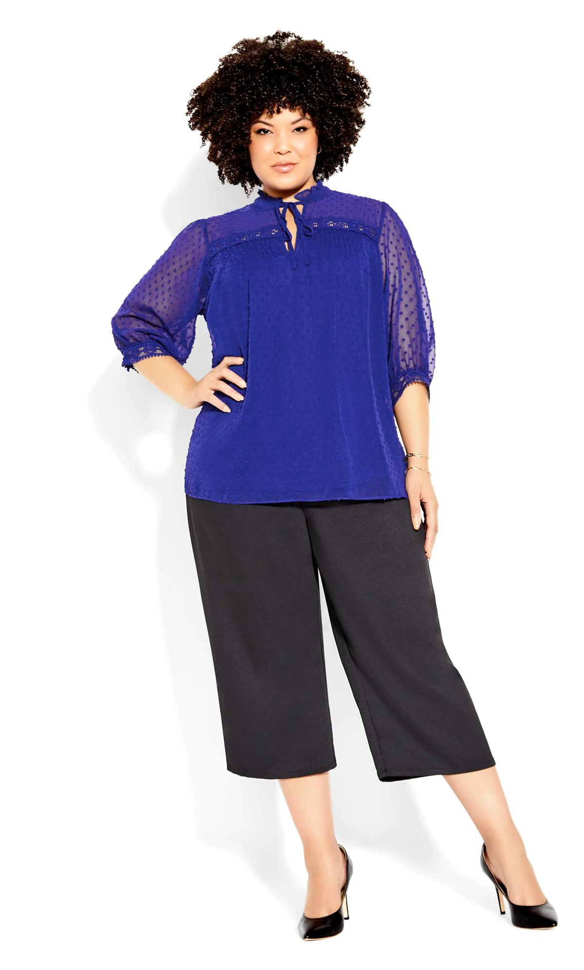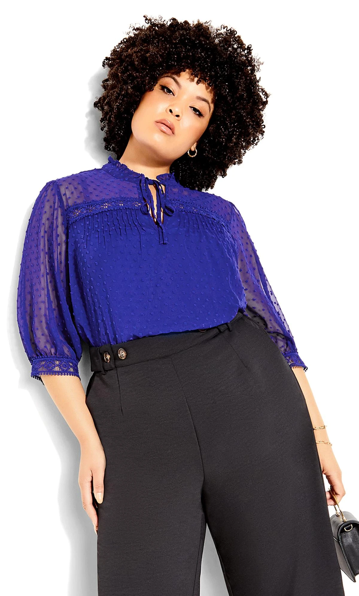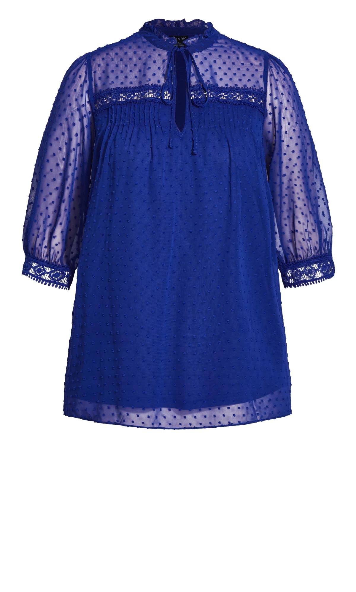 Elevate your style with this City Chic Blue Dobby Tie Neck Blouse. This elegant blouse features a tie neck detail that adds some sophistication and grace to your look. This blouse is perfect for work, dinner, or any occasion where you want to impress.