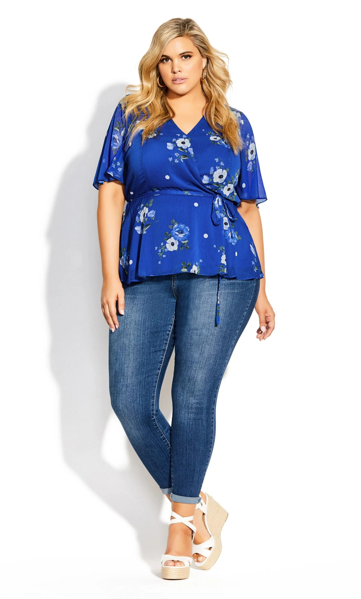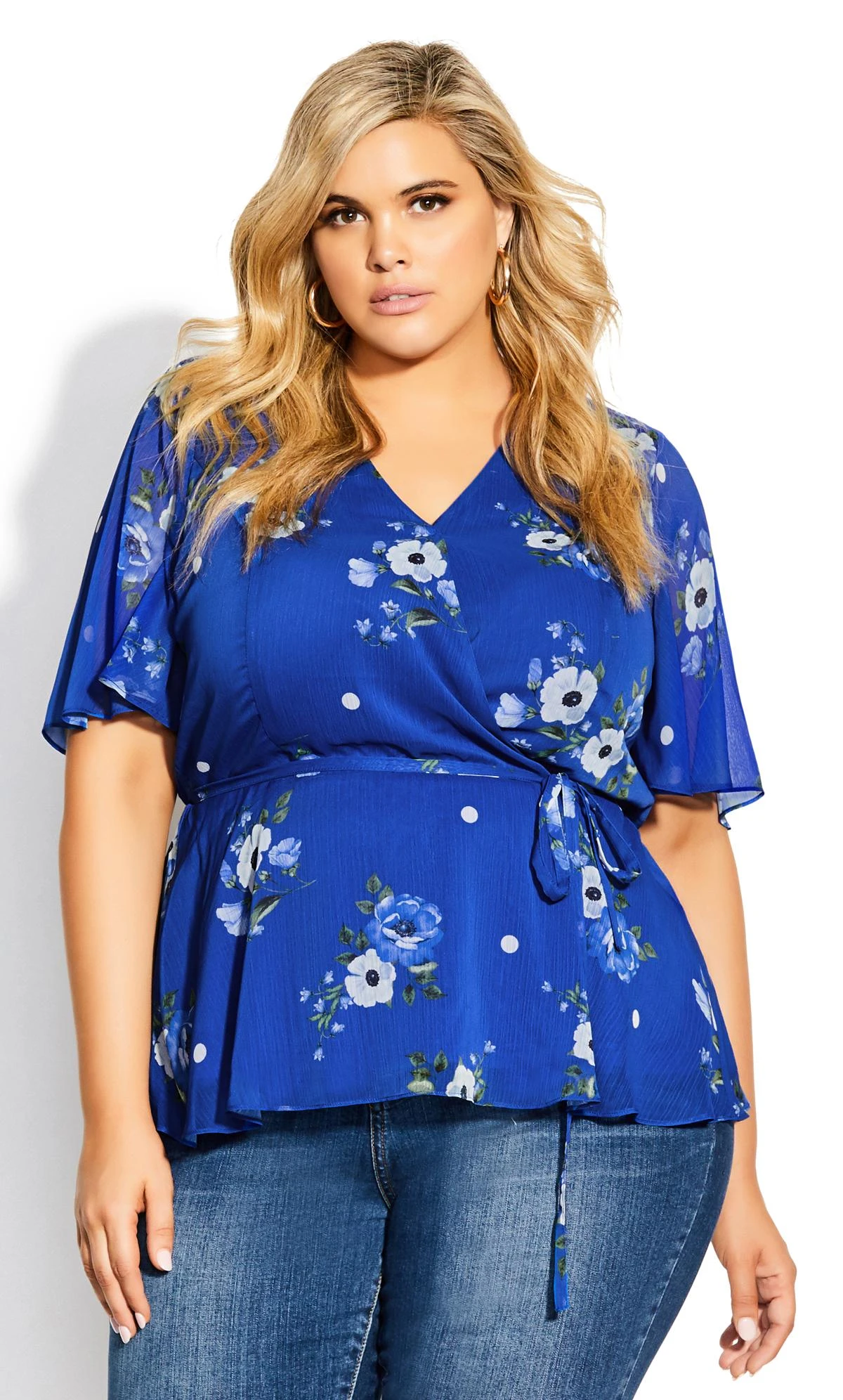 Embrace enchanting elegance in the City Chic Blue Floral Satin Wrap Top. Delicate blue florals bloom on sumptuous satin, creating a captivating blend of luxury and style. The flattering wrap design cinches your silhouette, while the timeless print adds a touch of charm. Perfect for both day and night, this top effortlessly elevates your look with its versatile appeal, capturing the essence of refined sophistication and ensuring you make a stunning statement with every wear.