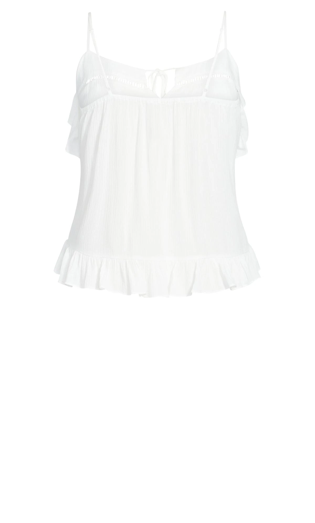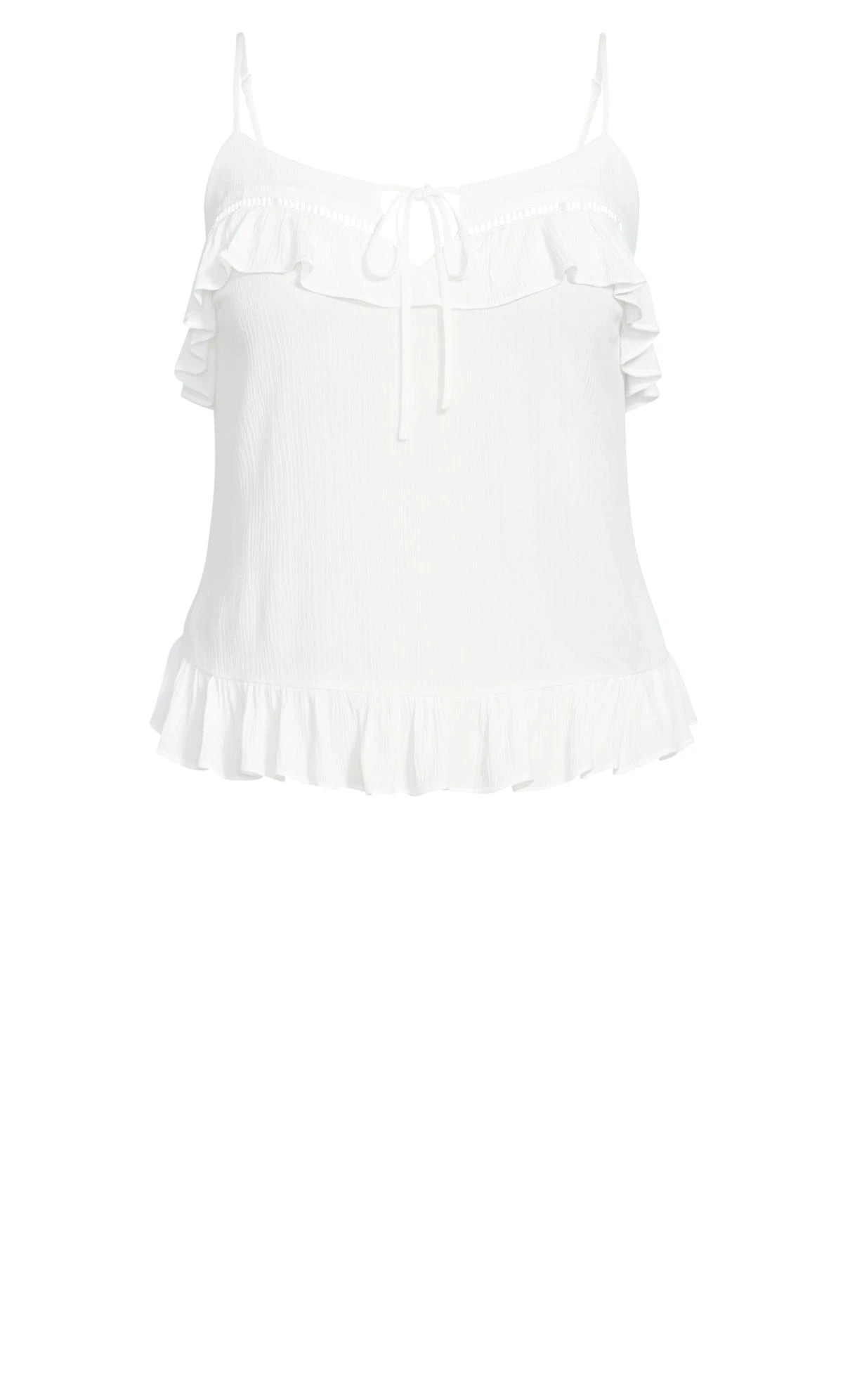 Introducing the CCX White Ruffle Cami Top – where elegance meets effortless style. Adorned with delicate ruffles, this cami offers a light, airy feel, making it the perfect piece to elevate your summer ensembles.