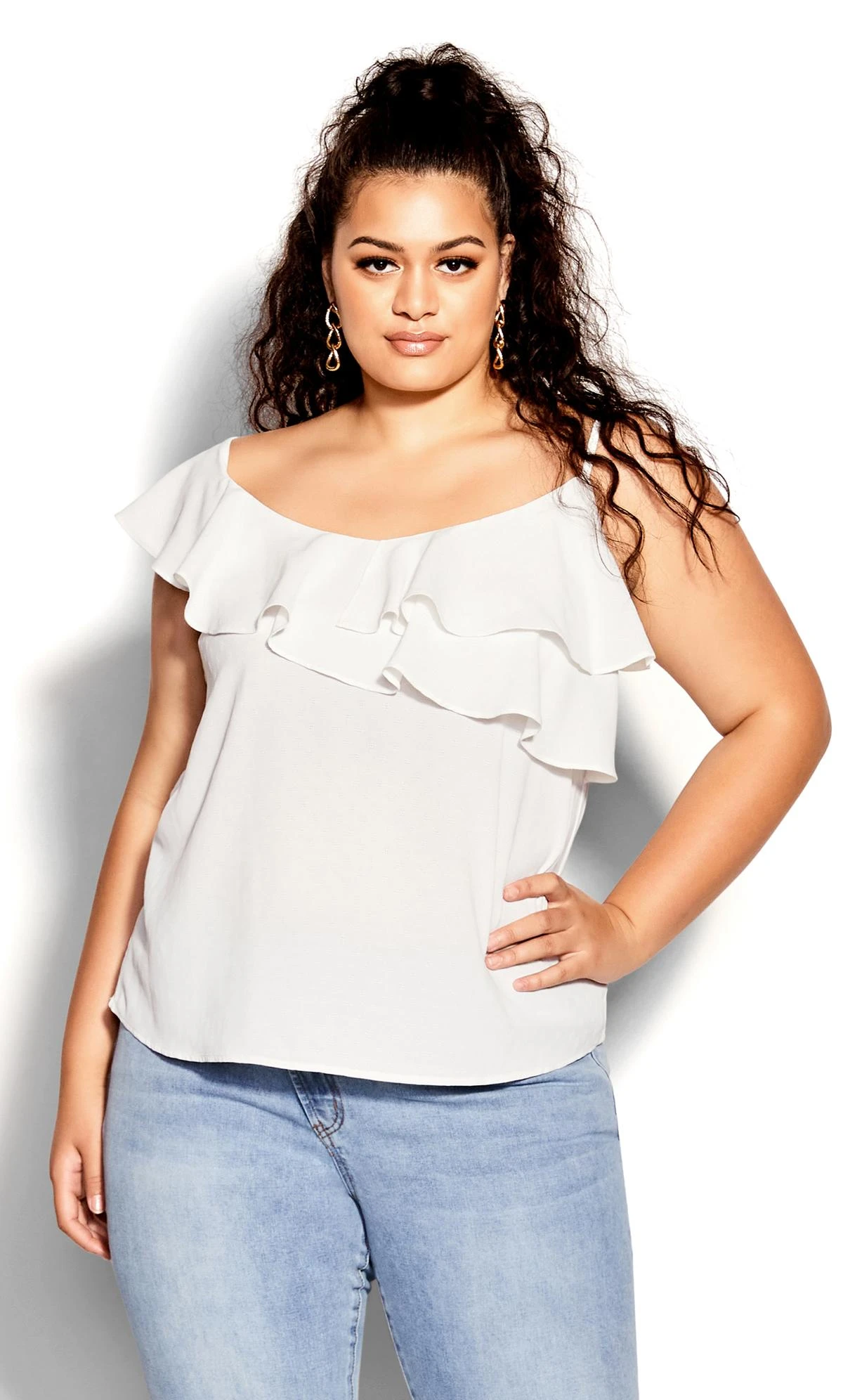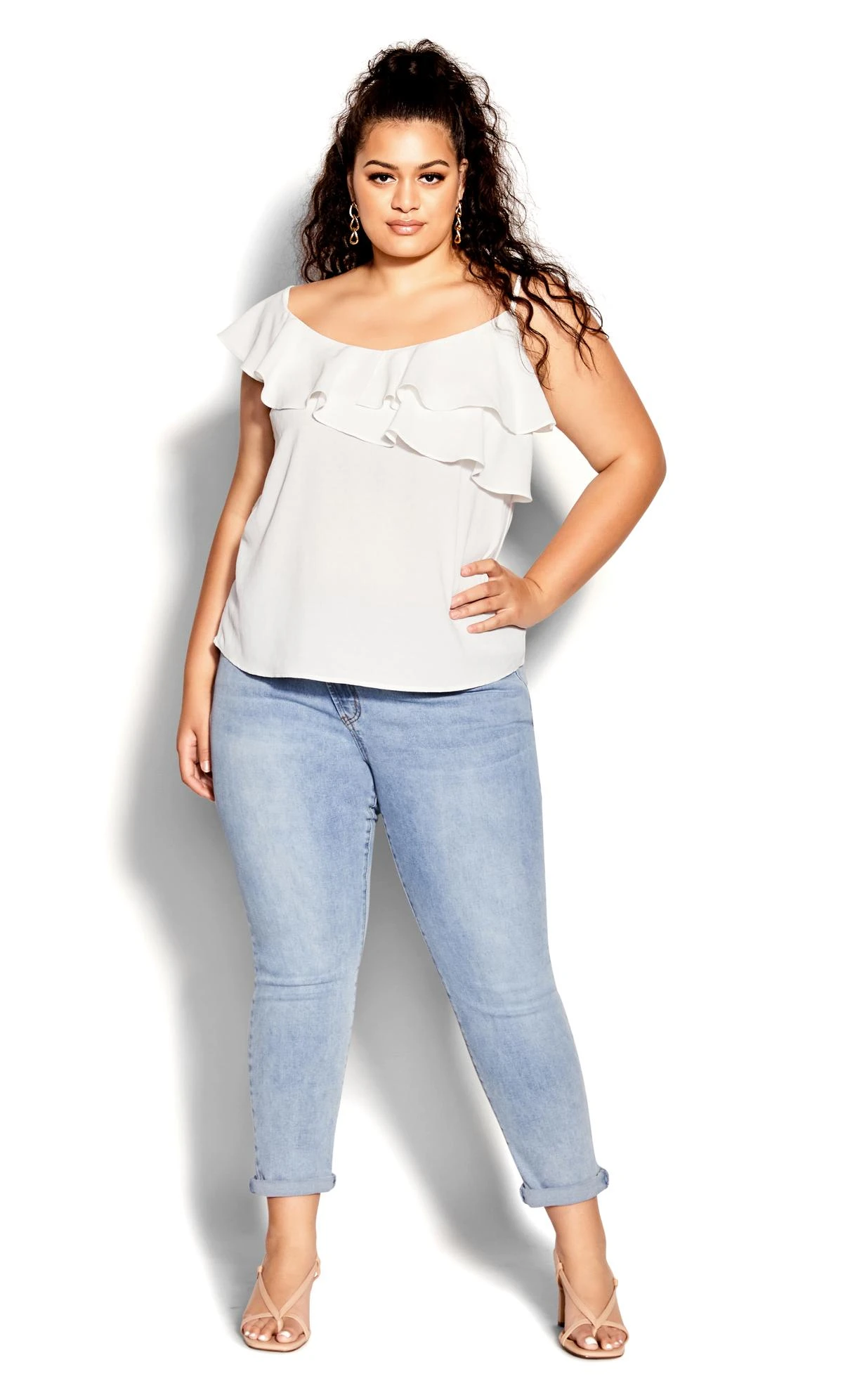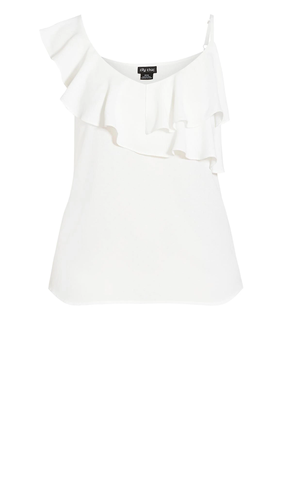 Elevate your ensemble with the City Chic Ivory Asymmetric Ruffle Vest Top. Delicate ruffles cascade asymmetrically, infusing modern charm into a timeless ivory backdrop. The relaxed fit ensures comfort, while the versatile design effortlessly transitions from casual to chic. Embrace the allure of understated elegance in this captivating vest top, a flawless addition to your wardrobe.