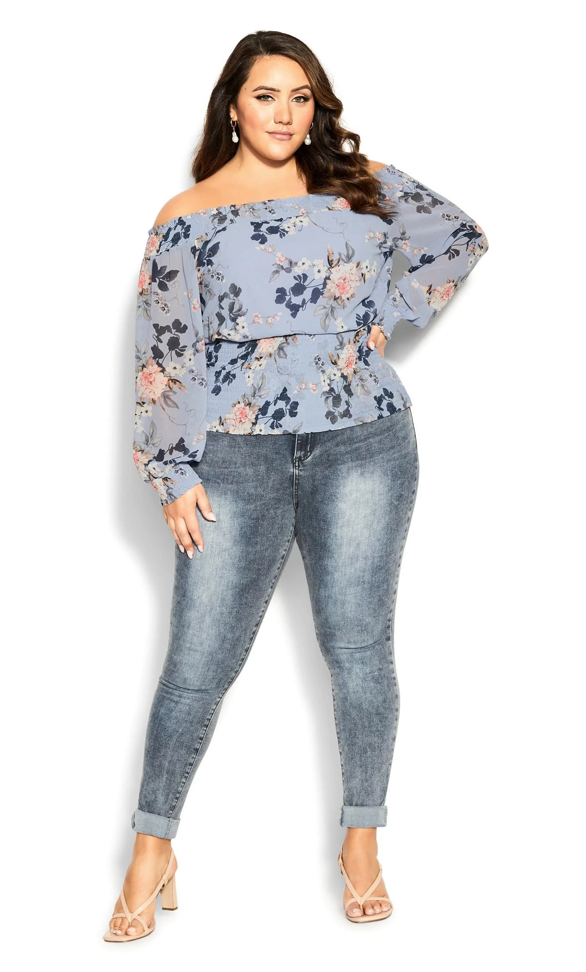 Elevate your style with the City Chic Light Blue Floral Print Bardot Top. This top exudes charm and sophistication, featuring a delicate light blue hue adorned with a captivating floral print. The Bardot neckline adds a touch of elegance, making it a perfect choice for both casual and dressy occasions where you want to embrace femininity and flair effortlessly.