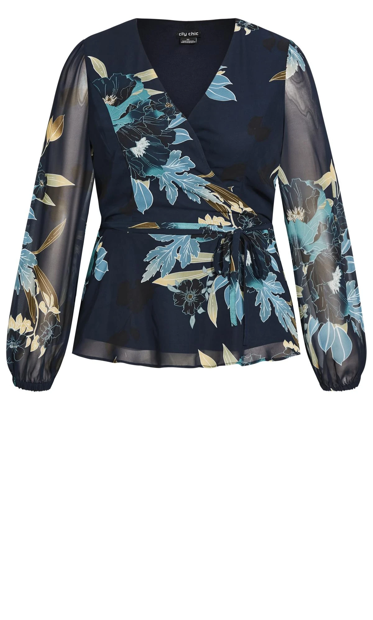 – Faux-wrap V-neckline