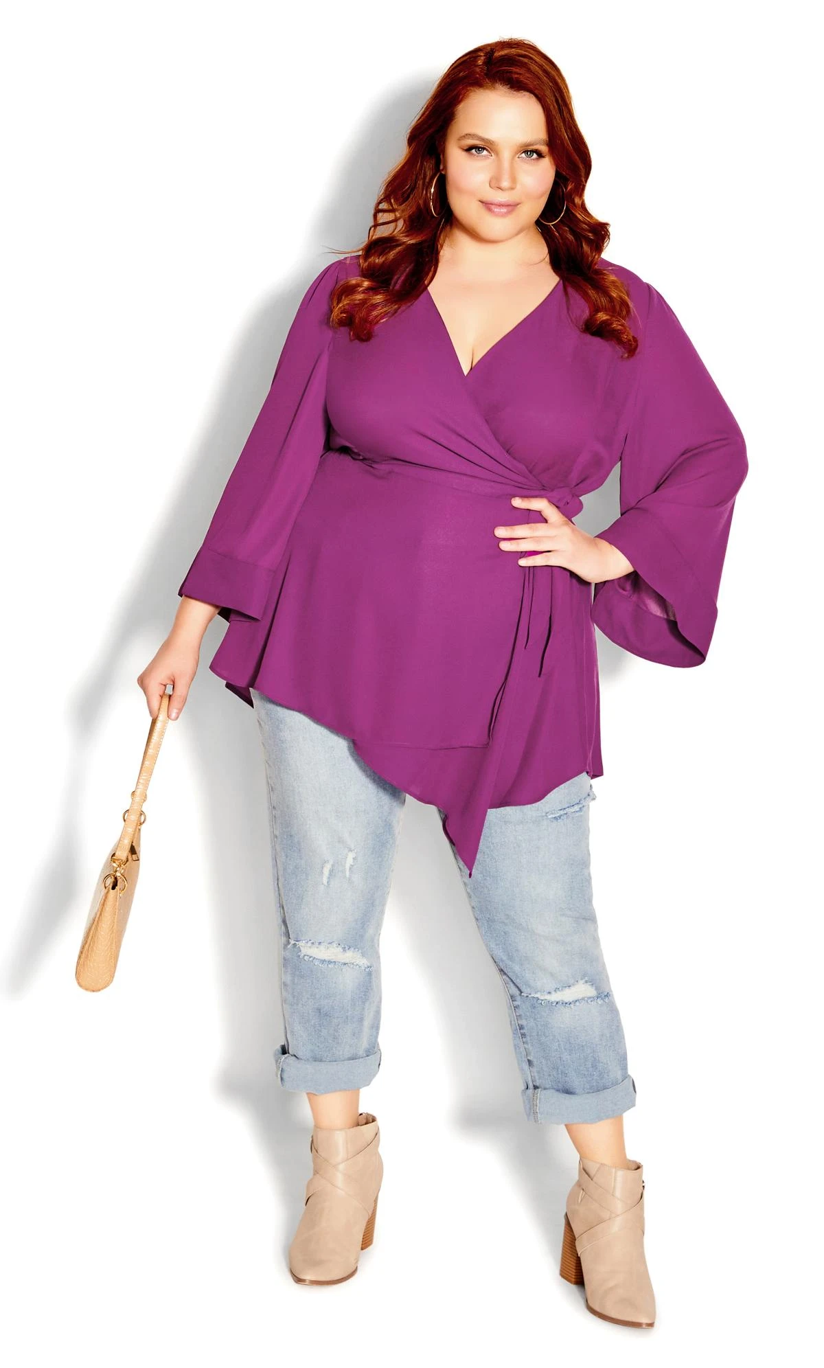 Elevate your wardrobe with the City Chic Purple Asymmetric Wrap Top, a fusion of modern style and timeless elegance. This top features a captivating shade of purple and an eye-catching asymmetric wrap design, adding a touch of intrigue to your outfit. With its versatile appeal, it’s perfect for both casual gatherings and elevated occasions, allowing you to effortlessly showcase your unique sense of fashion.