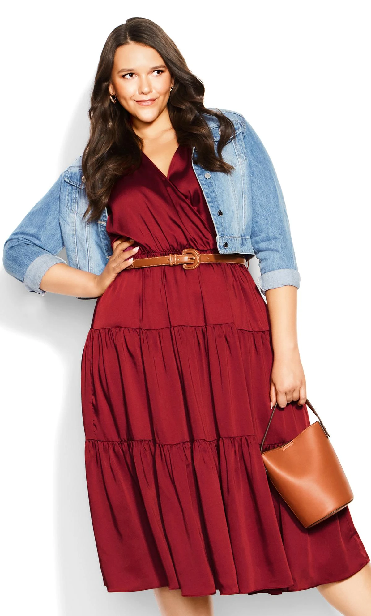 Discover the allure of the City Chic Dark Purple Tiered Wrap Dress. With its rich hue and tiered design, this dress strikes the perfect balance between sophistication and charm. Wear it with ankle boots and a statement necklace for an effortless daytime outfit, or dress it up with heels and elegant accessories for a captivating evening ensemble.