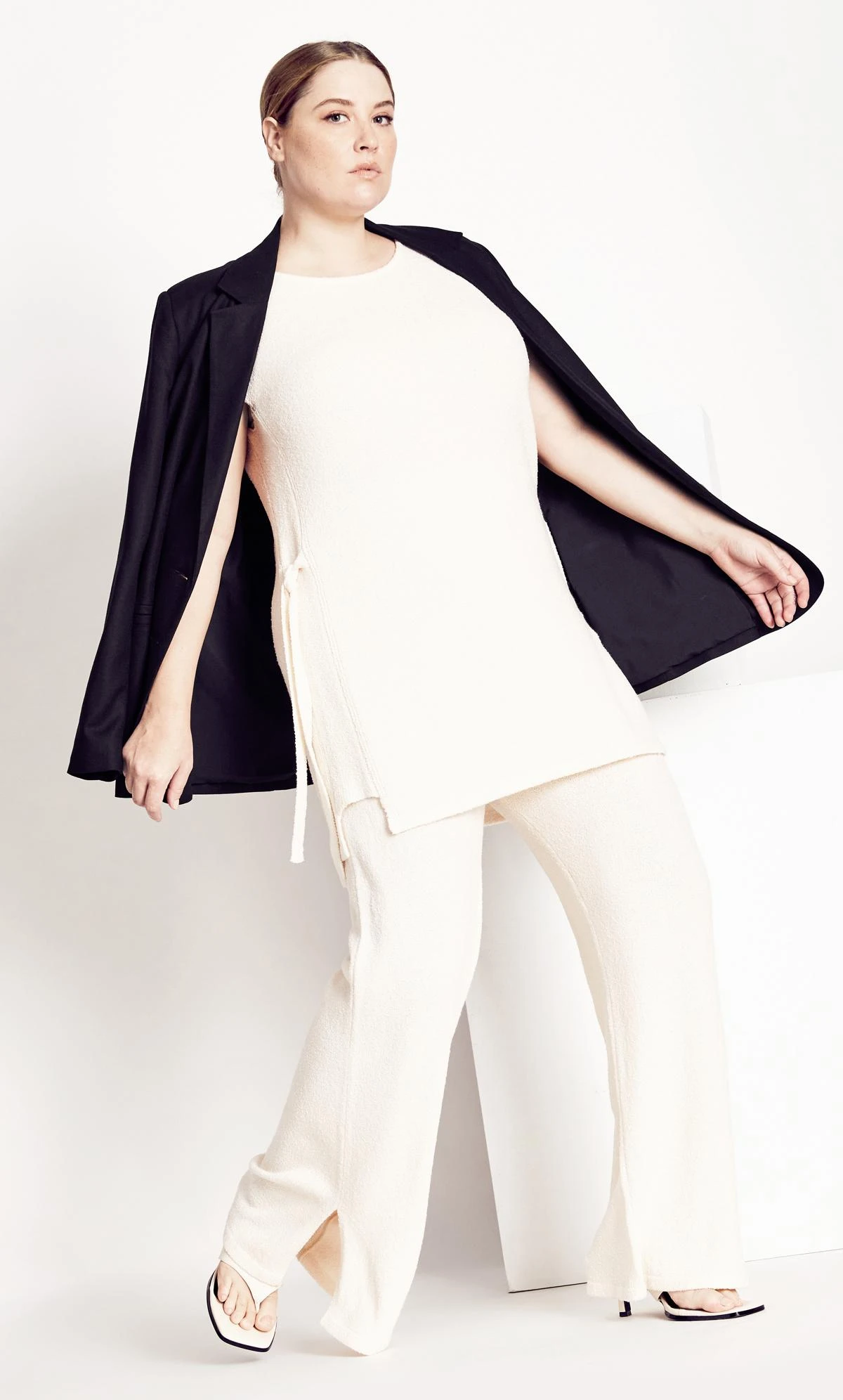 – Subtle side cut-outs at hem