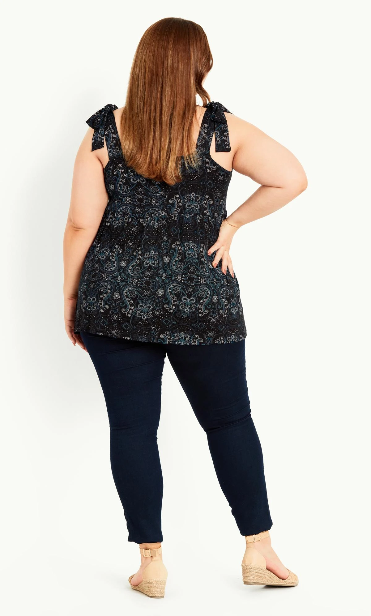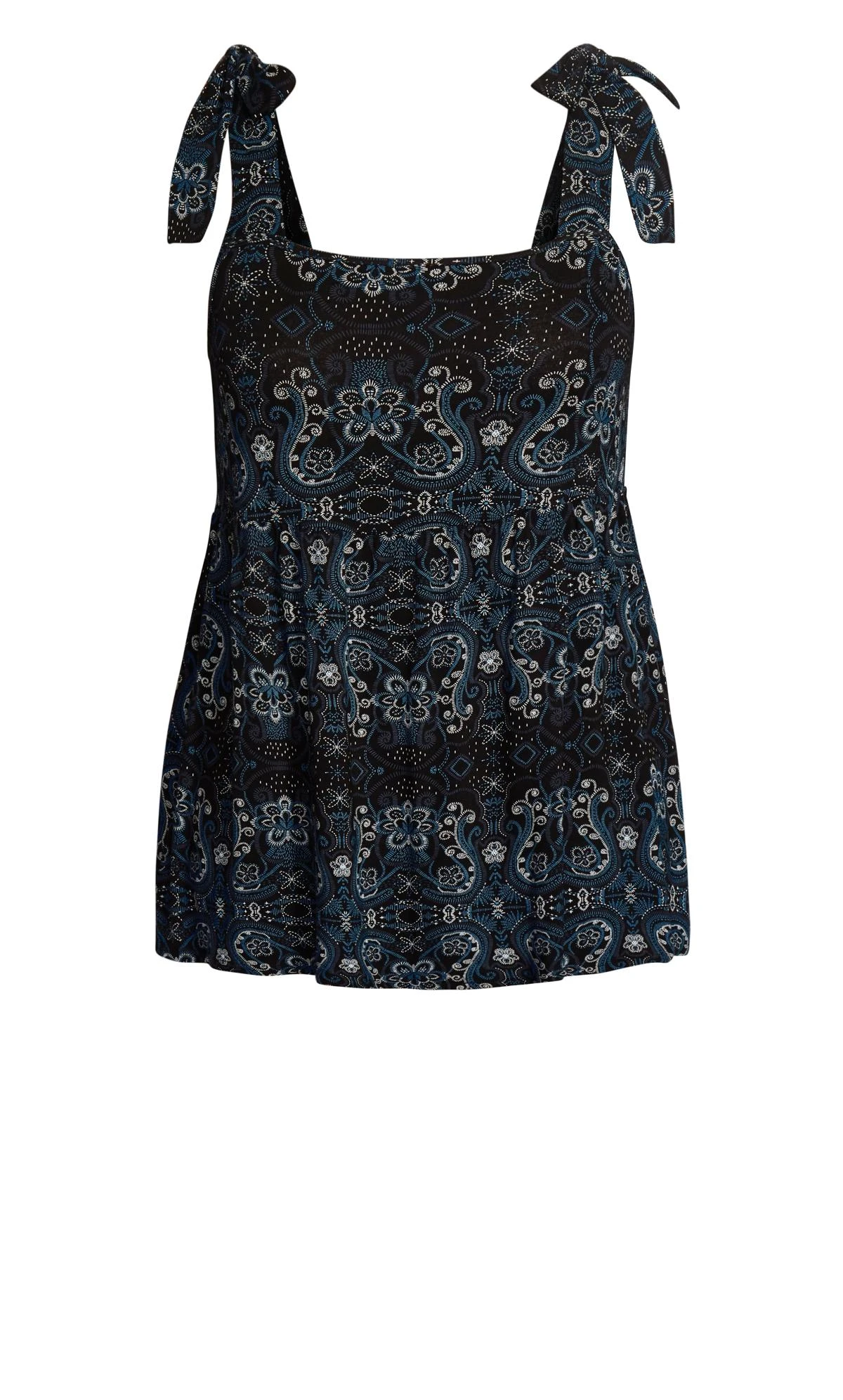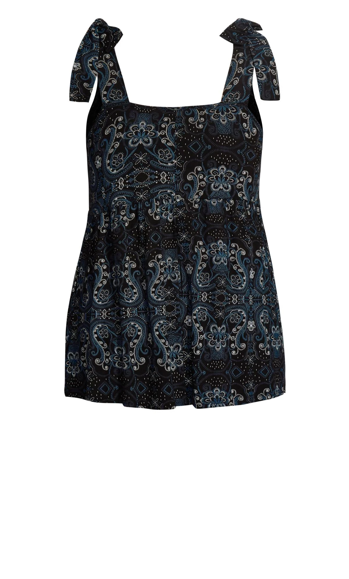 Experience boho-chic elegance with the Evans Black & Blue Paisley Smock Vest Top. Delicately adorned in a captivating paisley print, this vest top exudes effortless style. The smock silhouette offers both comfort and grace, making it a perfect choice for casual days or adding a touch of free-spirited charm to your ensemble. Embrace versatile sophistication with this wardrobe essential.