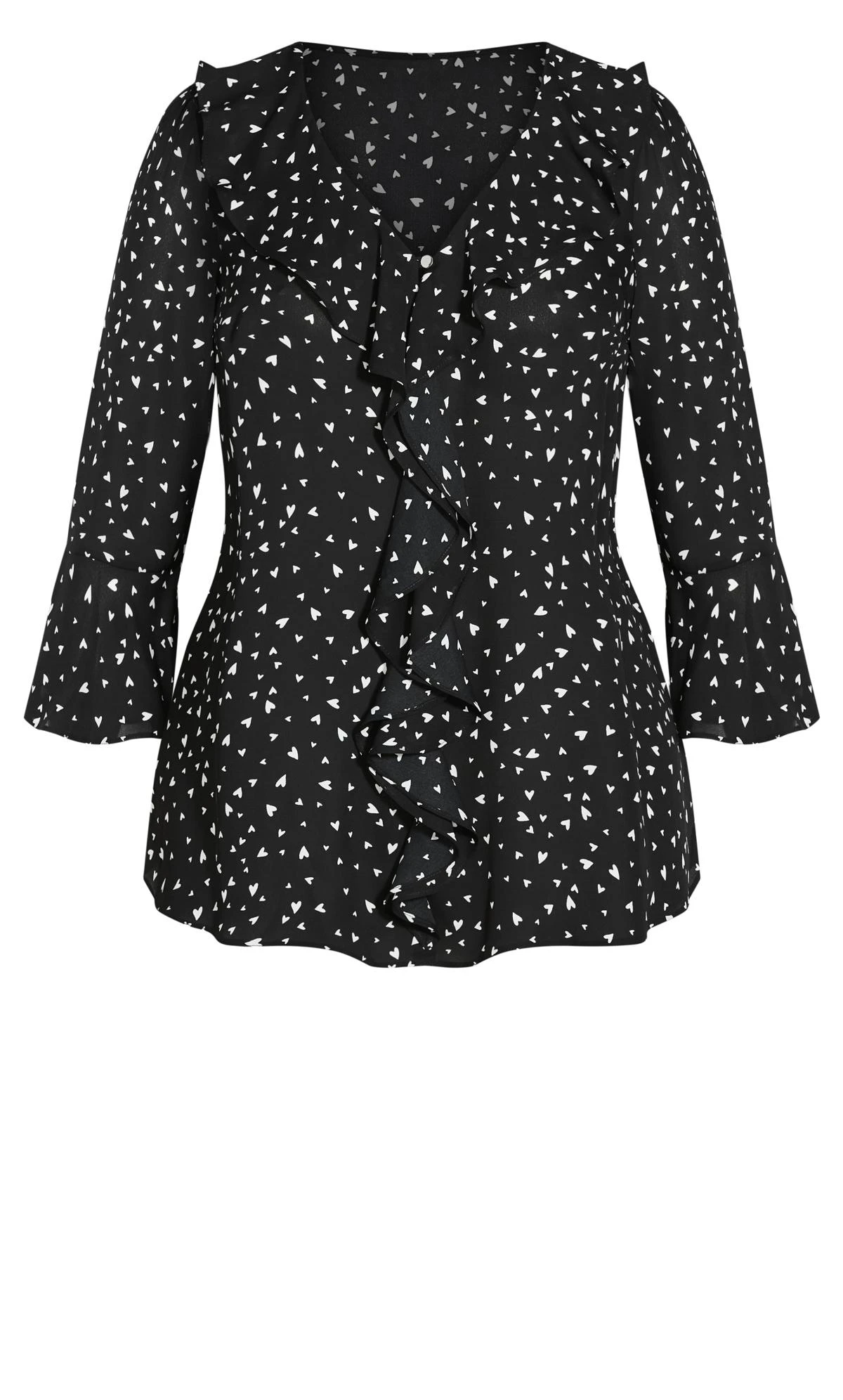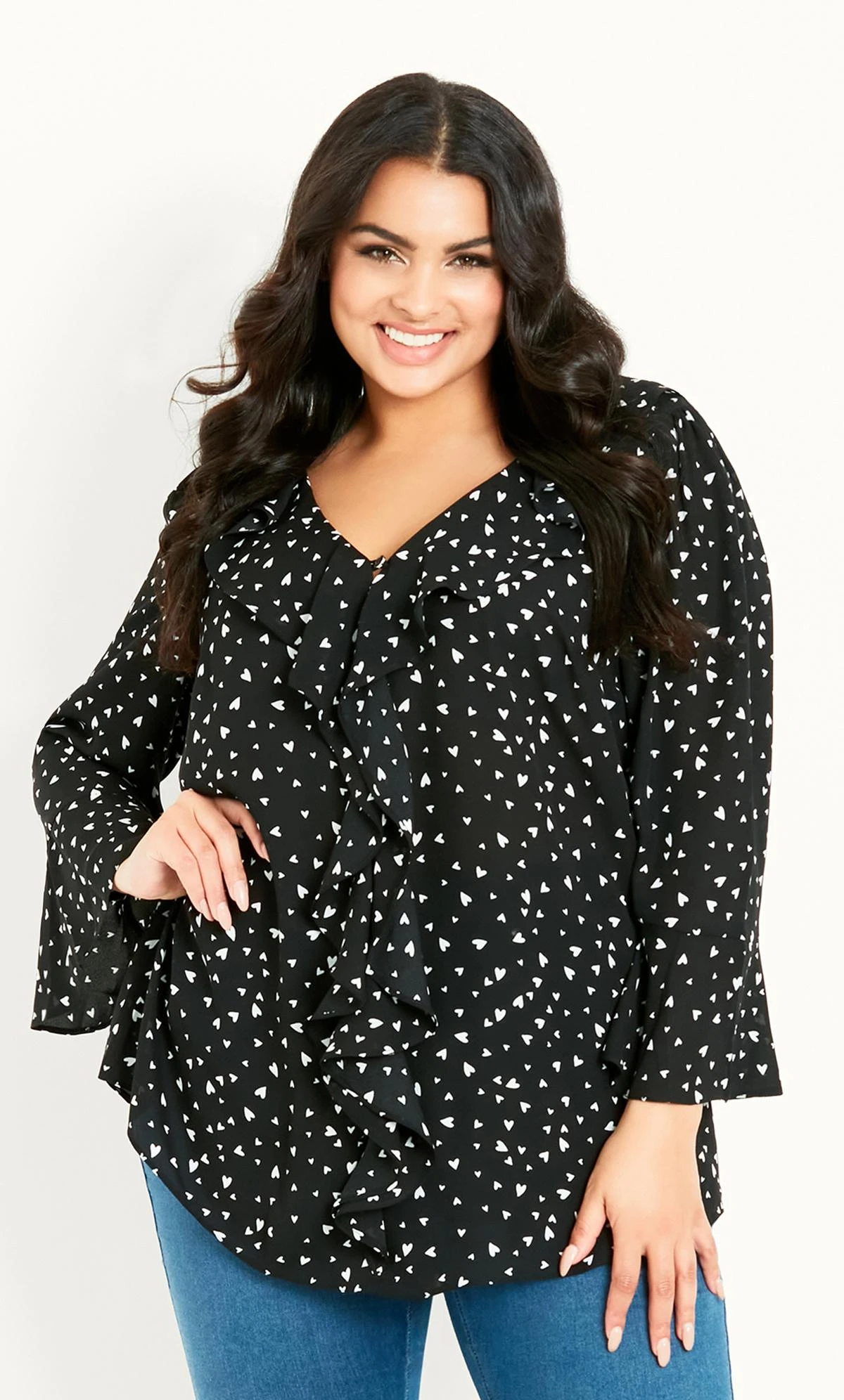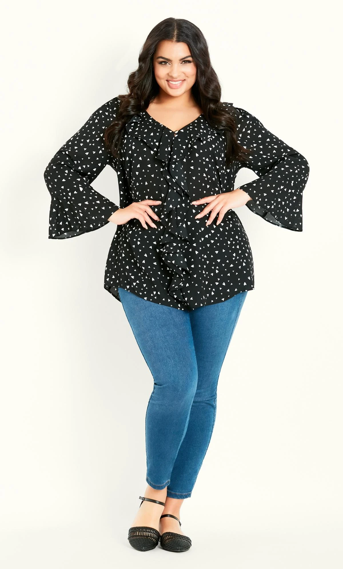 Elevate your look with the Evans Black Ruffle Trim Long Sleeve Blouse. With its elegant ruffle trim and long sleeves, this blouse effortlessly combines sophistication and style. Pair it with tailored trousers and heels for a polished office look, or wear it with jeans and ankle boots for a versatile ensemble that’s perfect for both formal and casual occasions.
