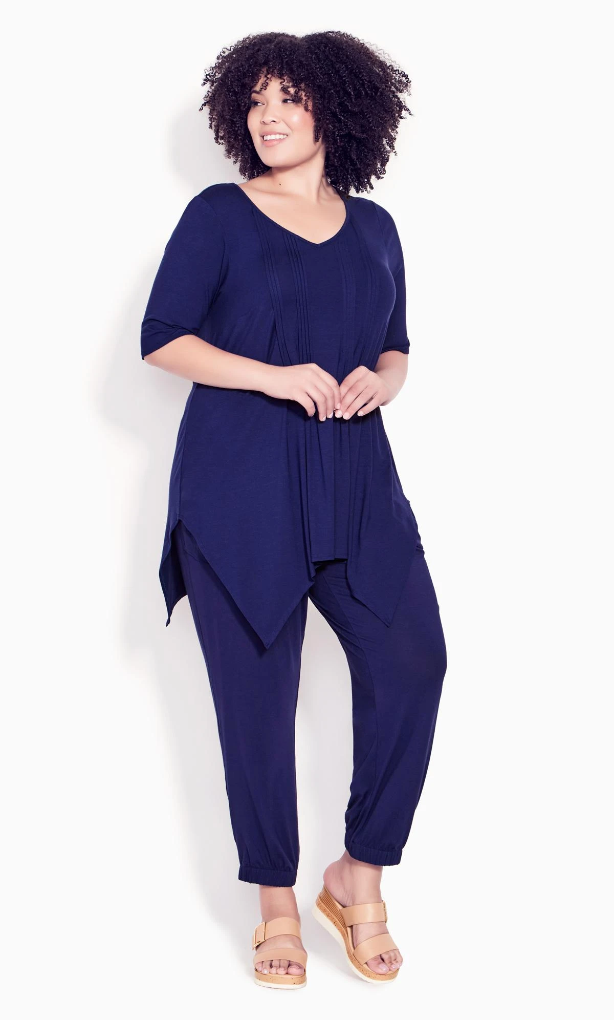 – Full length with elastic hemline